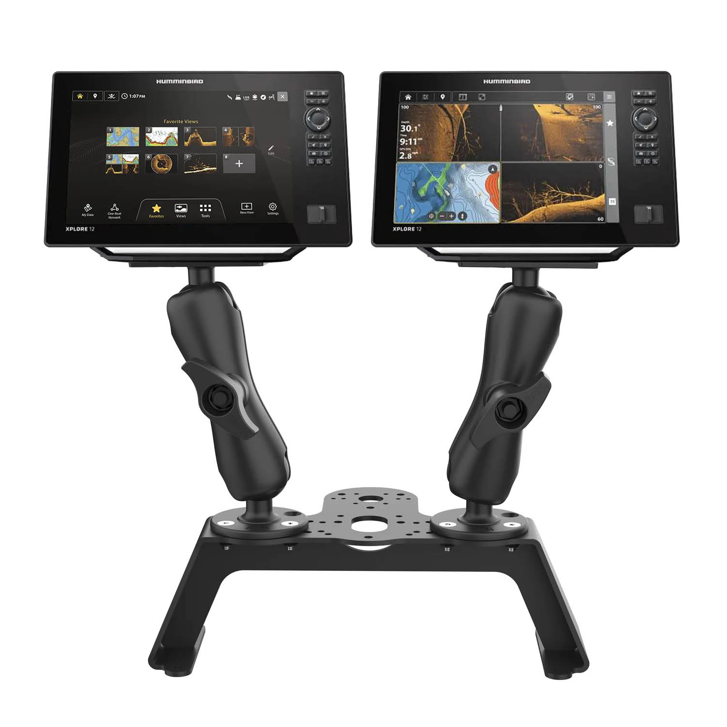 The RAM® Fishfinder Deck Kit with Dual Humminbird Helix 8-10 & XPLORE Mount (RAM-FF1-D-202-25-202-2) is a robust, powder-coated aluminum bracket configured with two D size fishfinder mounts that allows you to mount two Humminbird fishfinders side-by-side. Whether you're trolling deep waters or scanning shallow coves, this heavy-duty mount helps you take in more data for smarter navigation and better results.