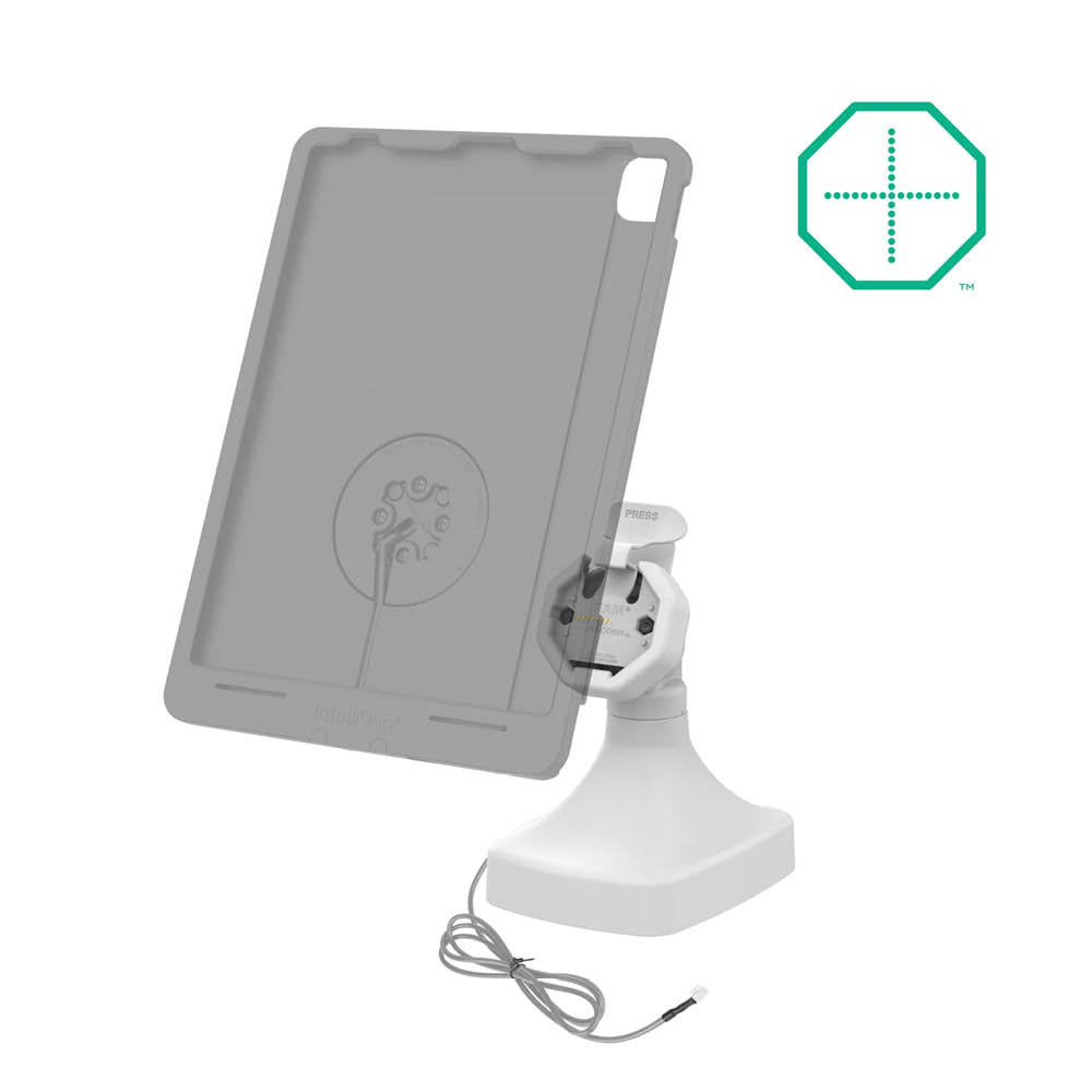 Die Snap-In Halterung hält Ihr Gerät sicher und ermöglicht gleichzeitig schnelles Laden über die integrierten Pogo-Pins, die Stromversorgung erfolgt über Power over Ethernet (PoE) und einen RJ45 Anschluss.