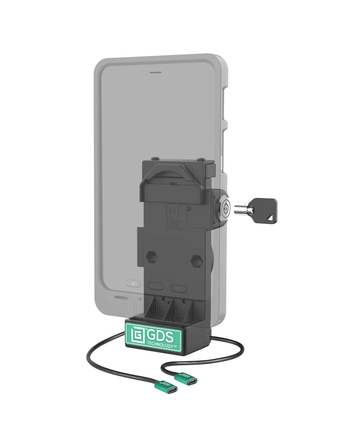 Die Sprunggefederte-Schnellverschlusslösung hält Ihr Gerät sicher in der Halterung und ermöglicht gleichzeitig schnelles Laden über die integrierten Pogo-Pins, die Stromversorgung erfolgt über einen USB-C Anschluss.