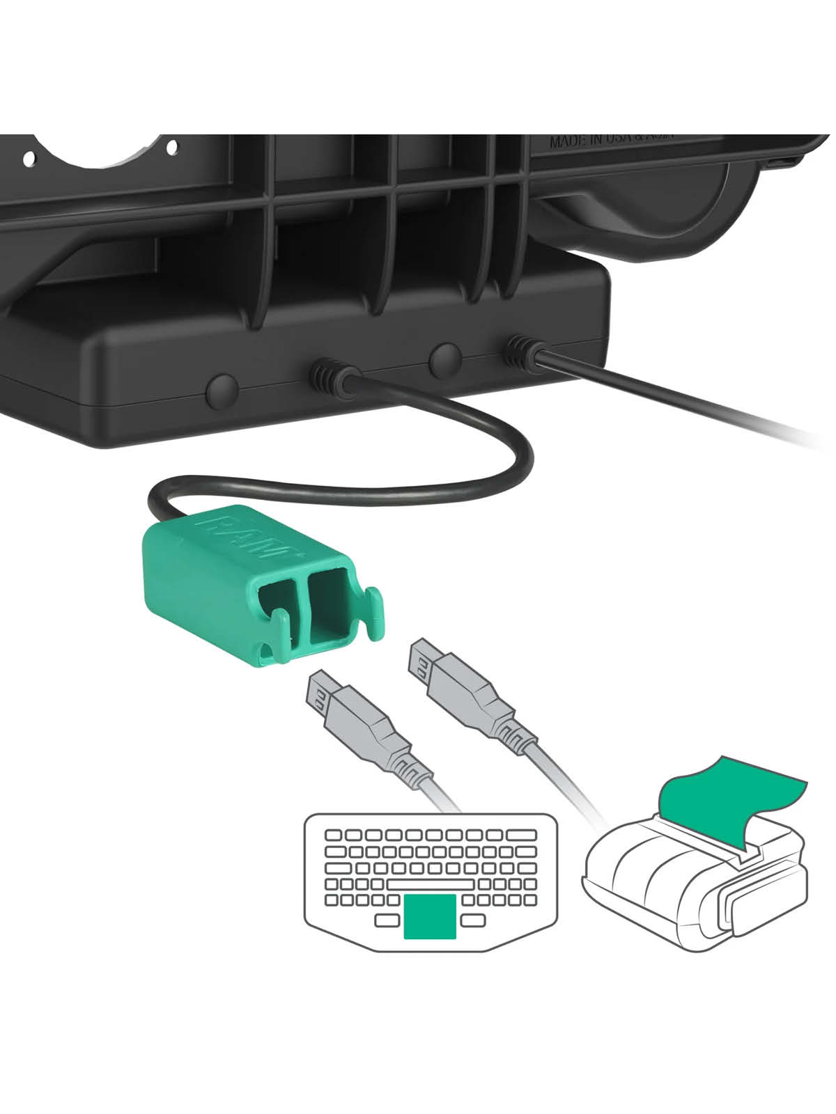 The holder is powered by a 5.5mm DC connection and charges the device in the dock while peripheral support is provided by the built-in dual USB Type-A cable.
