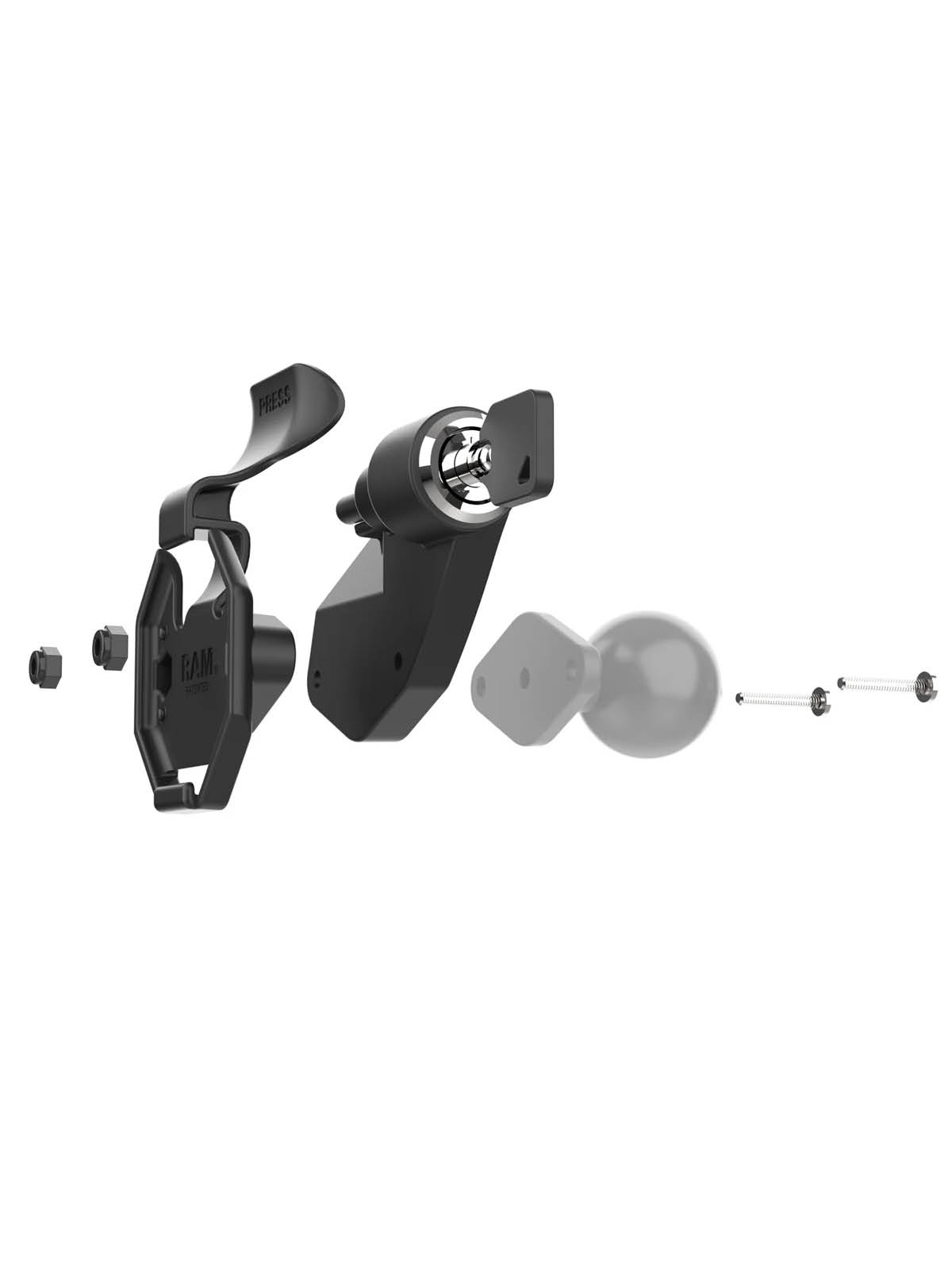 This RAM Mounts locking holder for tablets with GDS Uni-Conn adapter provides a secure snap-in attachment with a key lock mechanism.