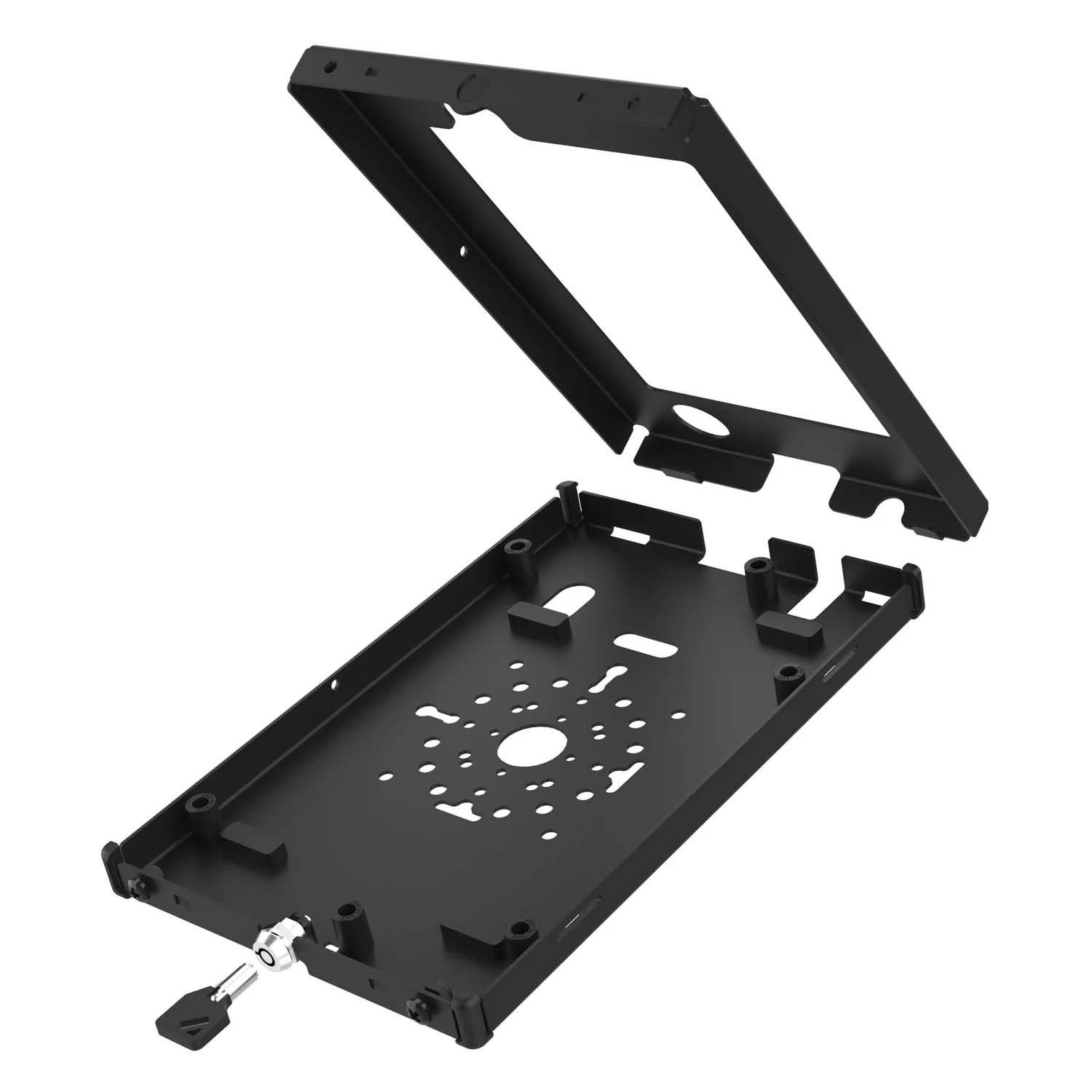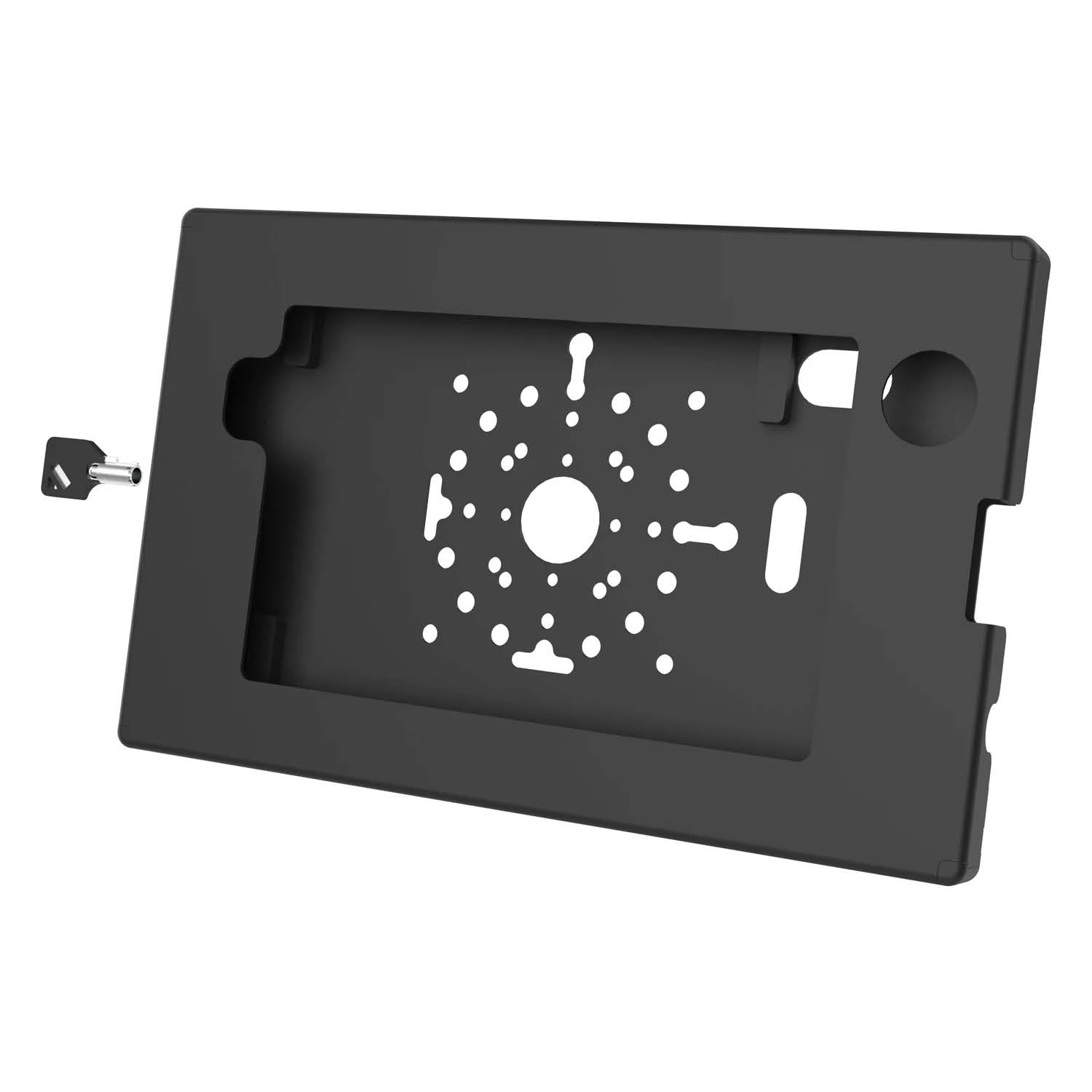 Ventilation slots and speaker openings maintain device functionality without compromising protection. The enclosure features versatile mounting options with integrated hole patterns for flush mounting, compatibility with RAM® double ball mounts, or 75x75mm VESA stands.