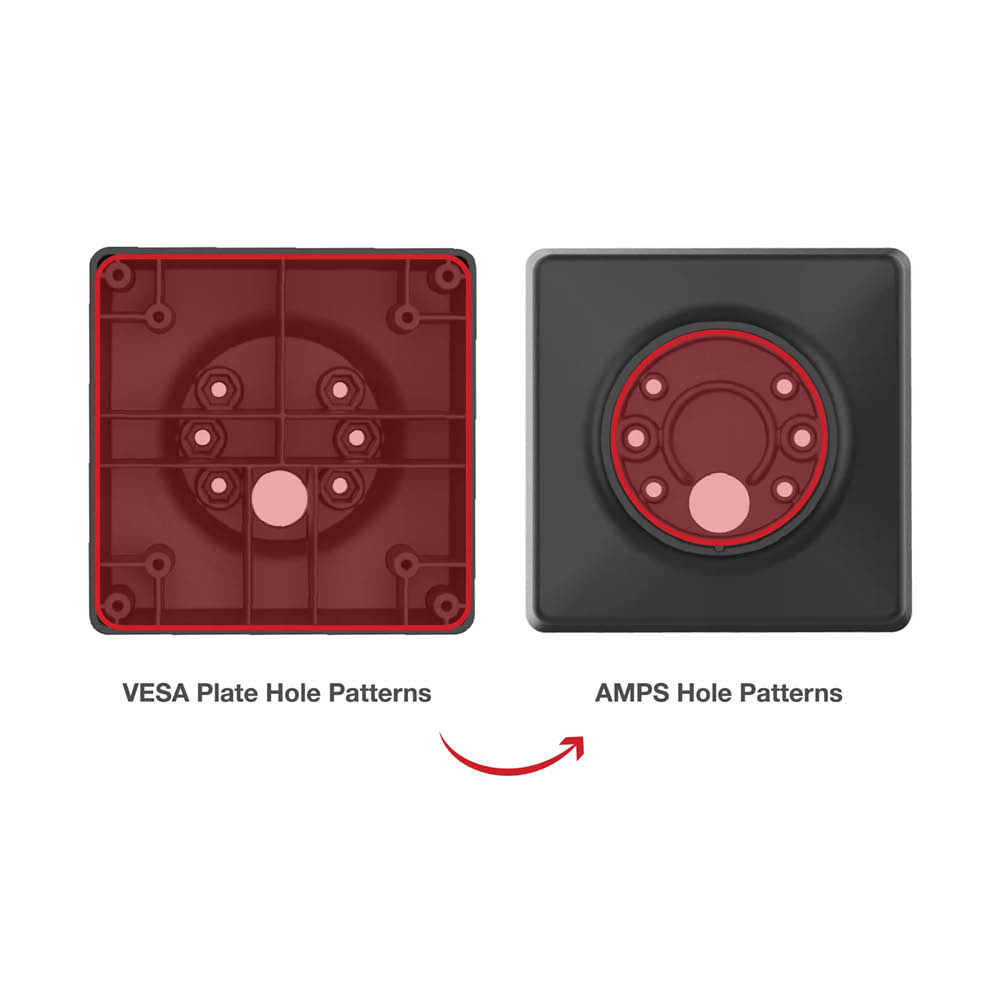 The RAM® 100 mm & 75 mm VESA to AMPS Hole Pattern Adapter Plate (RAM-GDS-DOCK-D10VU) is a versatile adapter that can easily be integrated into your mounting system to provide additional clearance for device holders.