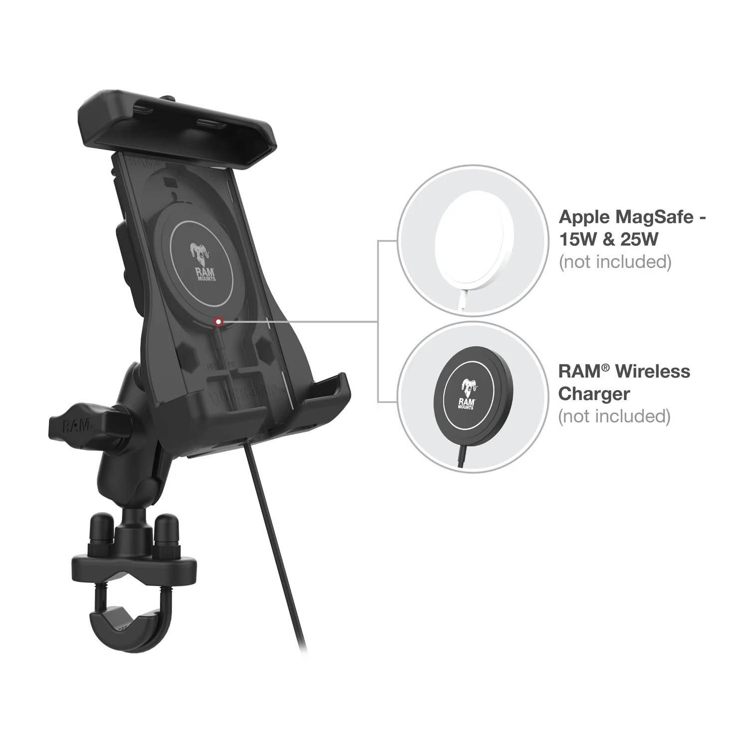 The RAM Quick-Grip product line gets an Apple MagSafe Charger compatible insert. Designed specifically to fit the official Apple MagSafe Charger, this RAM Quick-Grip phone holder has a removable backing plate so you can install your Apple MagSafe Charger directly into the holder with the ability to adjust the positioning of the charging disk depending on your iPhone 12 model iPhone. This insert allows a perfect and secure fit for the MagSafe's charging disk and is only compatible for the iPhone 12, 12 Pro, 12 Pro Max, and 12 mini with or without an official Apple MagSafe case. Included in this kit is the RAM Handlebar U-Bolt base with B size short length socket arm, perfect for handlebar mounting on your motorcycle, UTV, or e-bike. The U-Bolt base accommodates rails from 0.5" to 1.25" in diameter and includes a spacer for a tight fit without scratching the handlebar. Take advantage of your iPhone 12's magnetic MagSafe charging abilities with this MagSafe mount. --- feature_description --- device_compatibility Apple iPhone 12