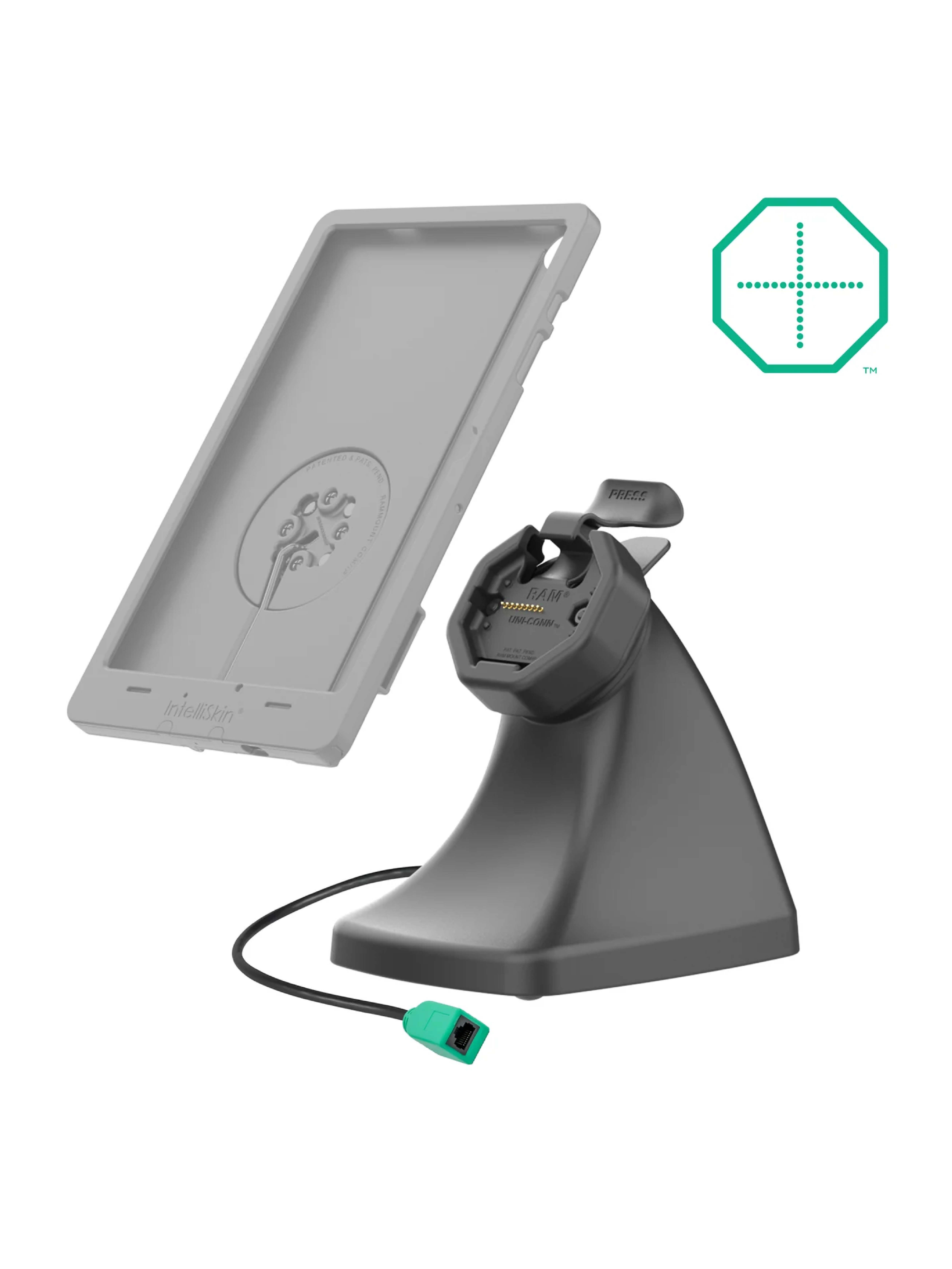 The GDS® Uni-Conn™ Powered Snap-In Kiosk Dock with PoE (RAM-GDS-DOCK-D10K-U3-POE) is a free-standing, powered dock with ethernet capabilities for devices enclosed in an IntelliSkin® Thin-Case™ with Rear Pogo Pads. Securely dock and undock your device with the assistance of the mechanical attachment mechanism.