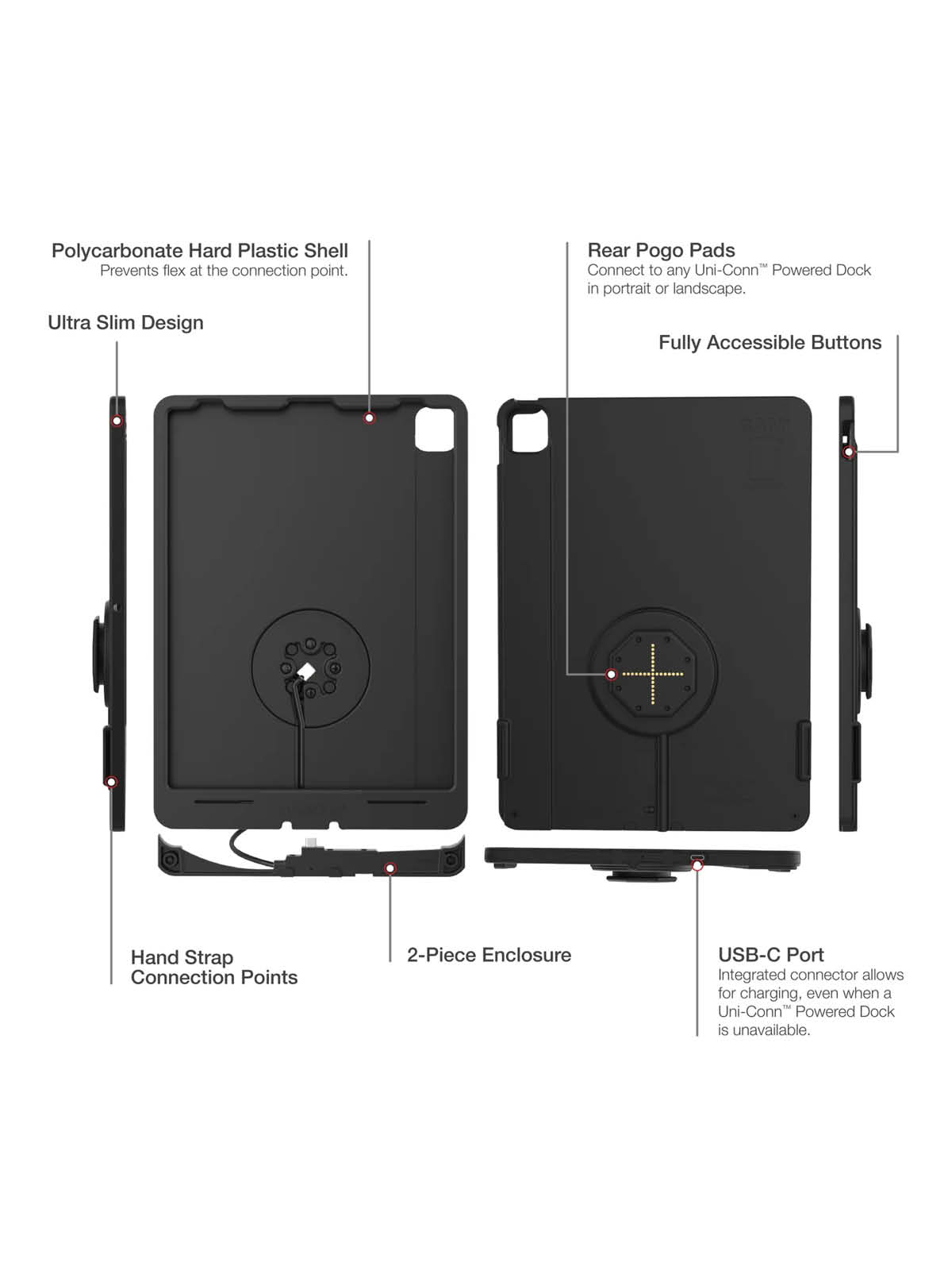 Diese RAM Mounts GDS IntelliSkin Thin-Case Ladeschutzhülle ist eine schlanke, robuste Schutzhülle für das Apple iPad Pro 12.9 (3.-5. Gen.) mit rückseitigen Pogo-Pads – entwickelt für die GDS Uni-Conn Dockingplattform.