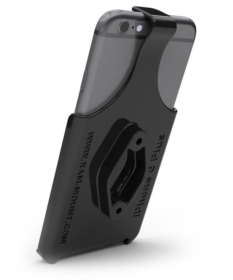 RAM MOUNT Gerätehalteschale für das Apple iPhone XS Max / / PLUS / 6 PLUS (ohne Schutzhüllen oder Ähnliches). Die Rückseite der Halteschale ist für die Aufnahme einer Trapez-Basisplatte (B- oder C-Kugel) vorbereitet.