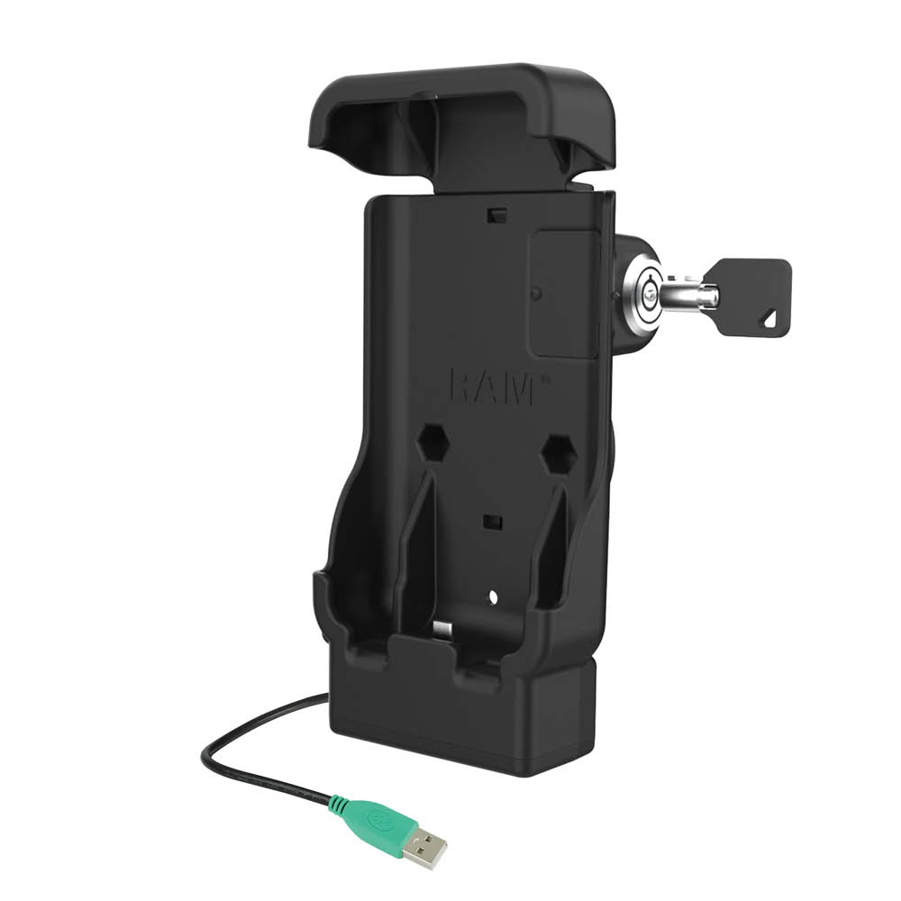 The GDS® Powered Vehicle Dock for Zebra EM45 with IntelliSkin® (RAM-GDS-DOCK-ZE38-A-PU) is a spring-loaded, quick-release holder that offers a secure fit with easy access to the mounted device. This docking station features a top-cup molded for the Zebra EM45, ensuring the device stays safe on the roughest roads.