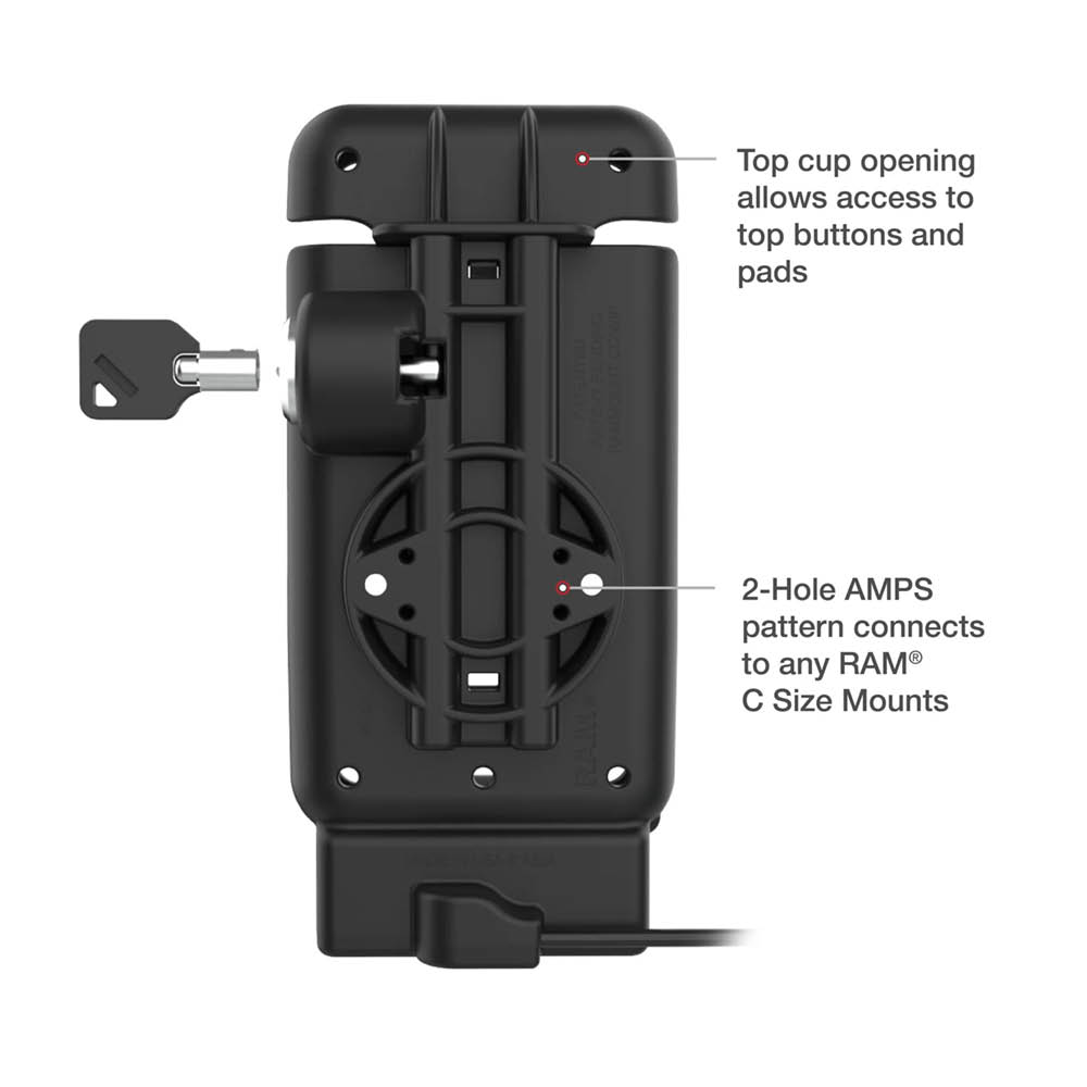 When docked, the built-in pogo pin docking contacts provide a seamless charging experience, powered by the USB-C female connector. Complete the solution by building your mount - these docks are RAM® Compatible™ equipped with a 2-hole AMPS pattern for adding a diamond ball adapter. Always Protected. Always Connected.®