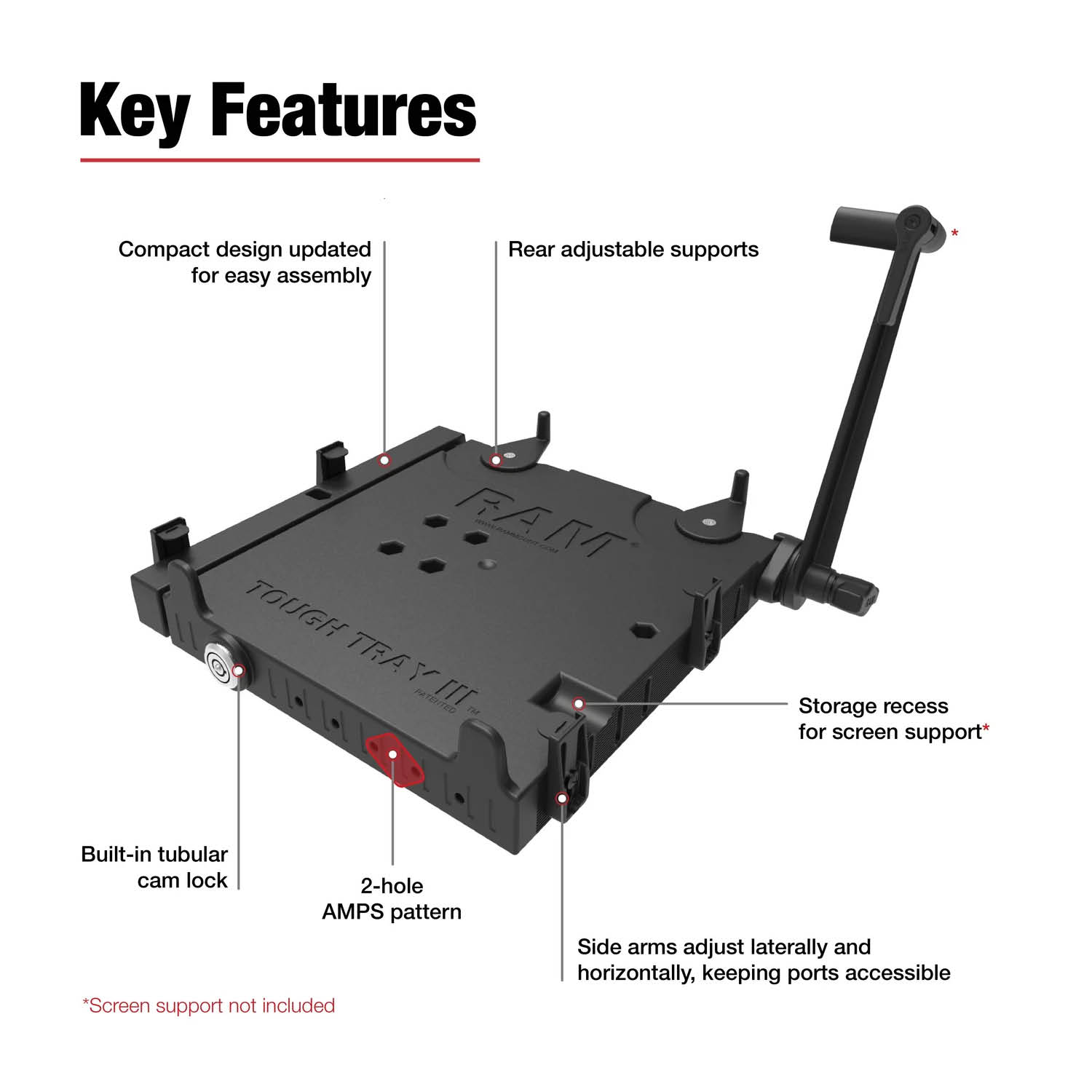 The Tough-Tray™ III also features a built-in recess for the RAM® Adjustable Laptop Screen Support, allowing it to nest cleanly when not in use, and is compatible with the RAM® Power Caddy for convenient power management. Integrated 2-hole AMPS mounting locations around the tray perimeter allow for easy attachment of accessories such as printers, handheld devices, or scanners.