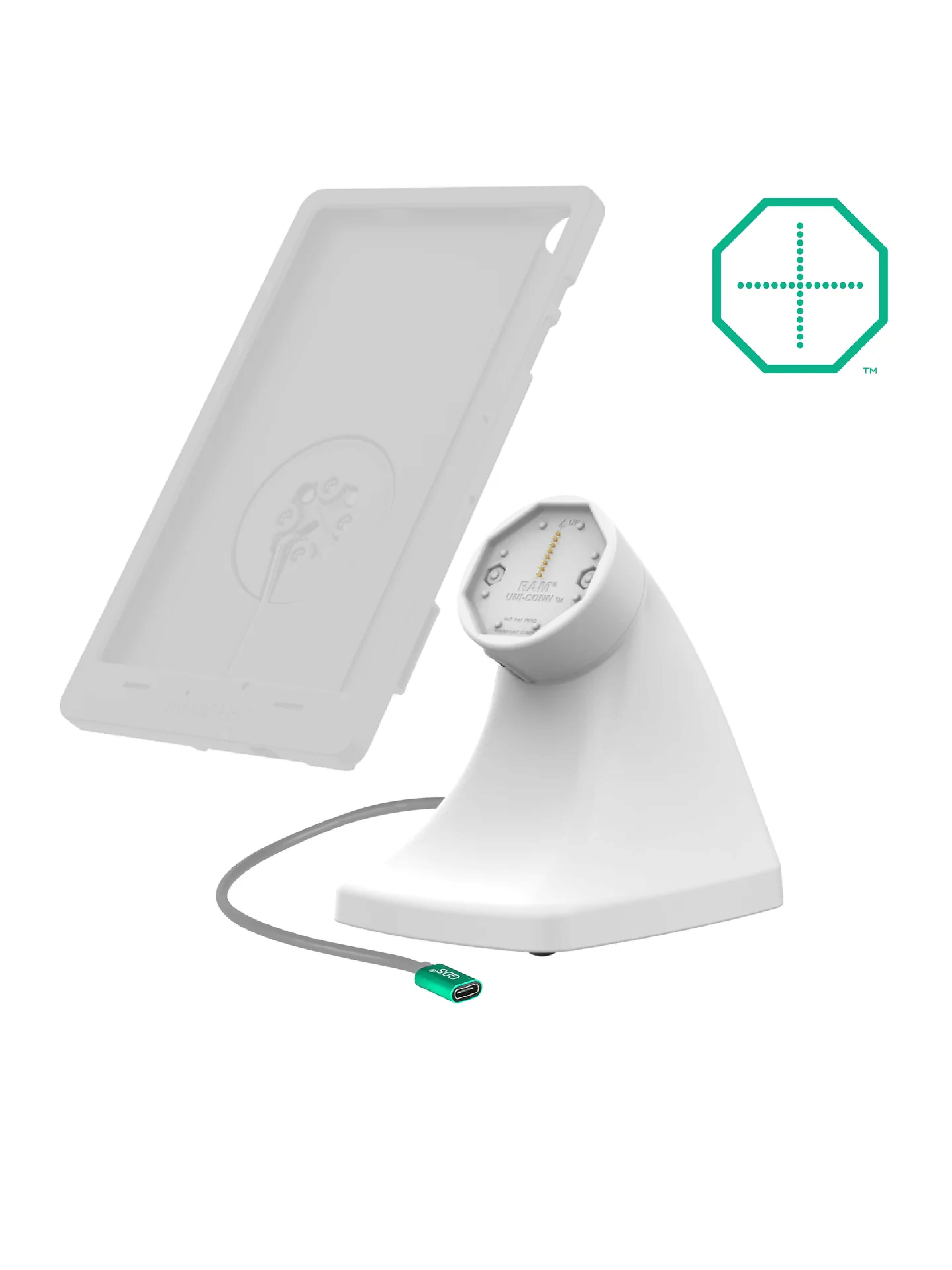 The GDS® Uni-Conn™ Powered Kiosk Dock with USB-C - Gray (RAM-GDS-DOCK-D10K-C-GRY) is a free-standing, powered dock for devices enclosed in an IntelliSkin® Thin-Case™ with Rear Pogo Pads. Easily dock and undock your device with the assistance of the magnetic attachment mechanism.