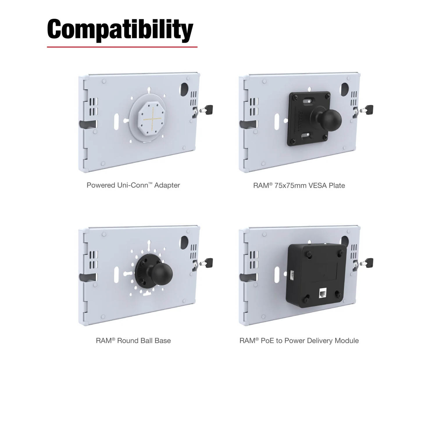 - Secure to RAM® ball mounts with VESA and AMPS pattern; or flush mount