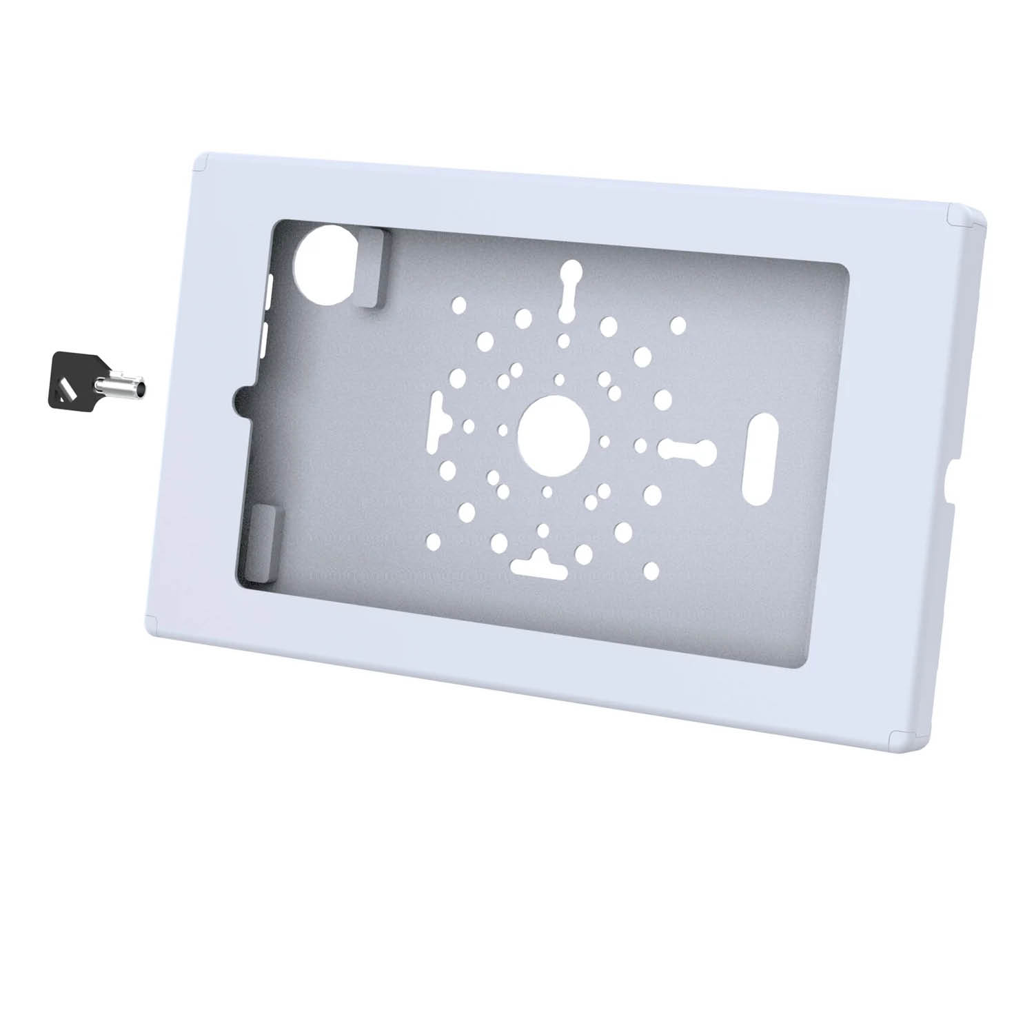 Ventilation slots and speaker openings maintain device functionality without compromising protection. The smooth gray finish not only blends well into professional and industrial settings but also adds a clean, modern aesthetic. The enclosure features versatile mounting options with integrated hole patterns for flush mounting, compatibility with RAM® double ball mounts, or 75x75mm VESA stands. For added docking functionality, the Safe-Case™ supports the installation of a GDS® Uni-Conn™ button - enabling rear pogo pin charging when paired with any compatible GDS® dock (look for the octagon icon on product listings).