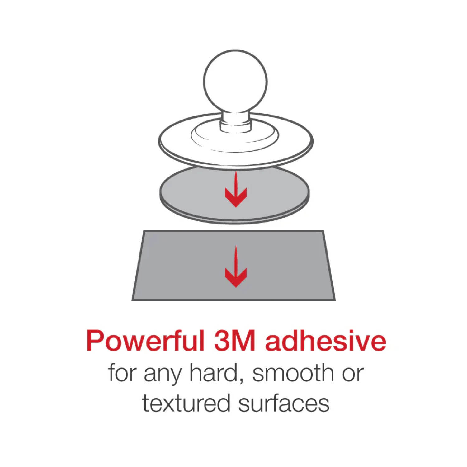 It combines the X-Grip holder with a medium-length double socket arm (B-size ball, 1“) and a round adhesive base (B-size ball, 1“) and making it suitable for a wide range of applications on flat surfaces.