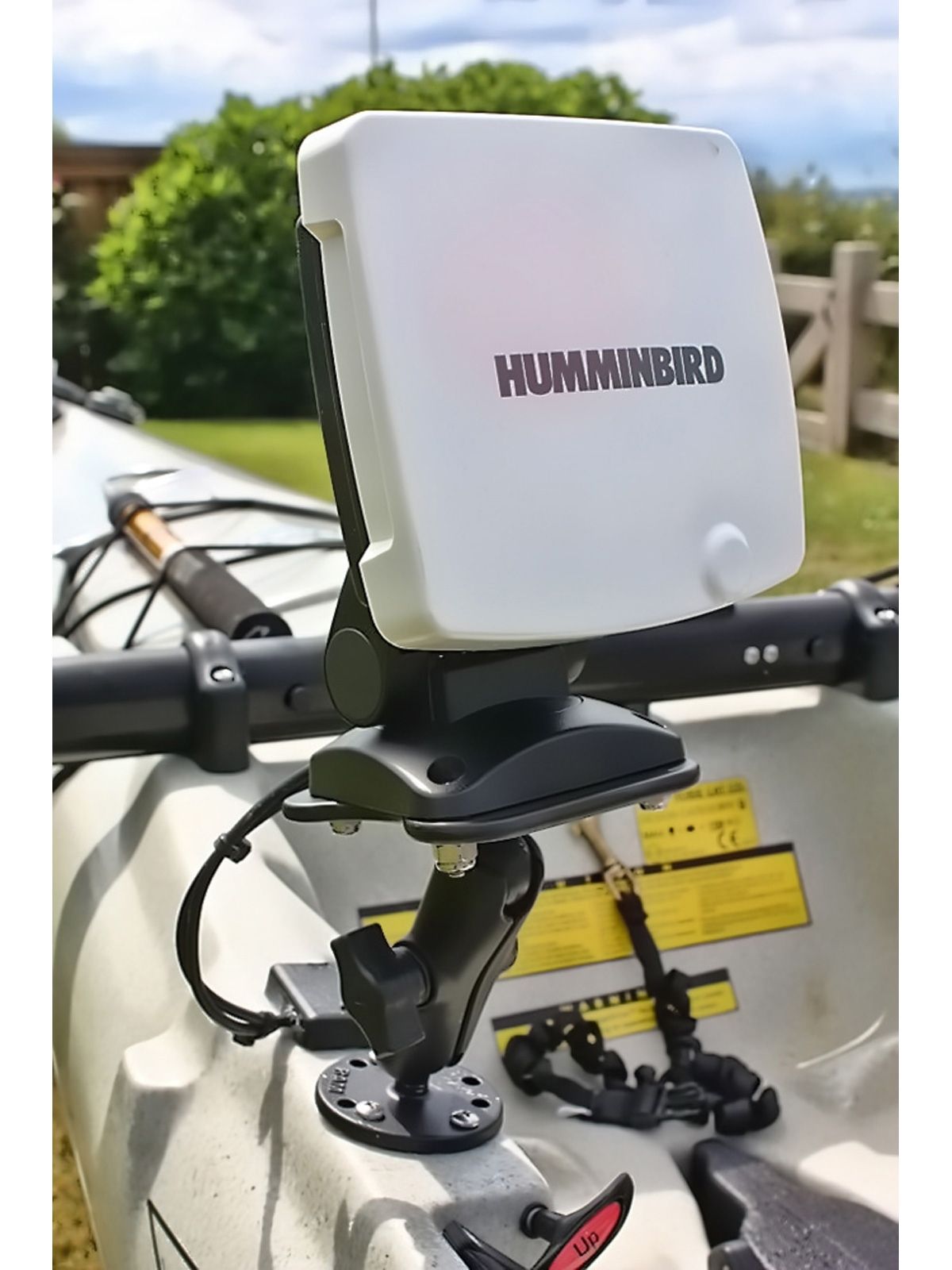 Im Einzelnen besteht das Set aus einer runden Basisplatte, einem mittleren Verbindungsarm sowie einer Adapterplatte für Humminbird Geräte. Die runde Basisplatte besitzt zwei Lochraster - AMPS 4-Loch sowie 120° 3-Loch.