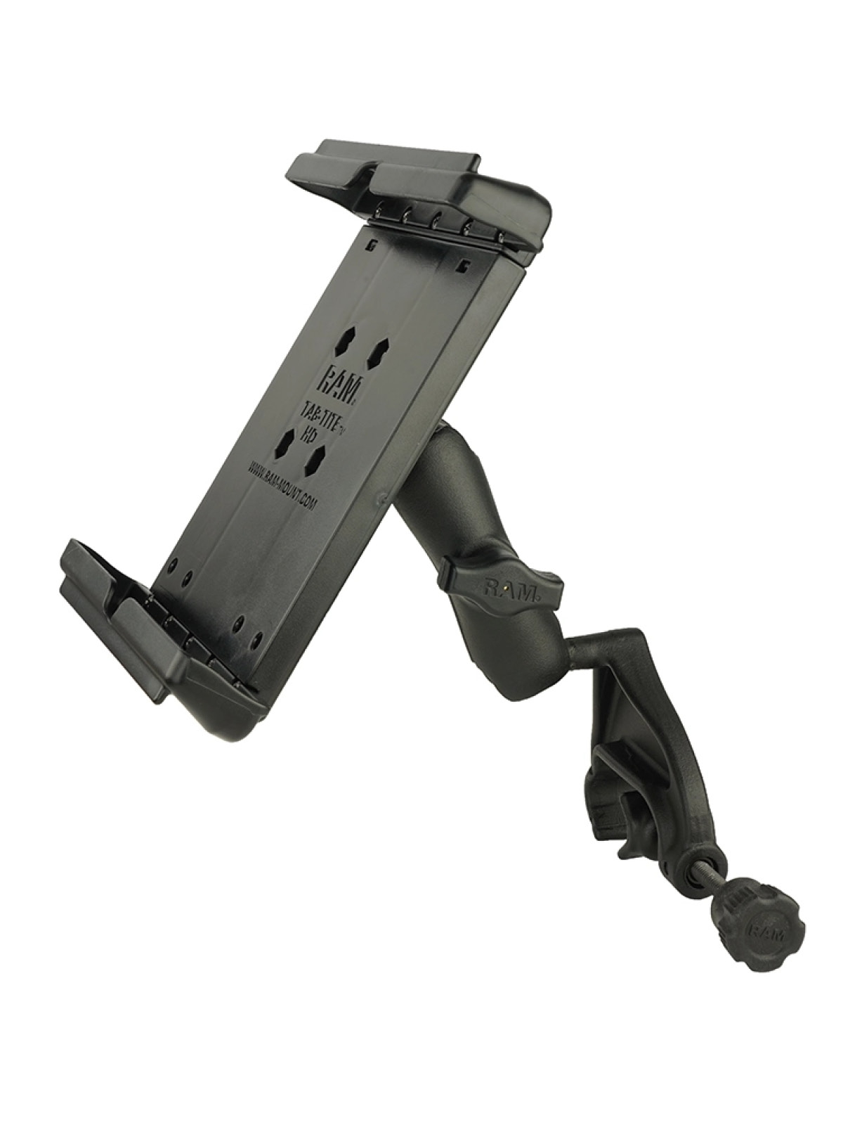 This ideal airplane yoke mount is designed specifically to hold any 8" tablet with a heavy duty case including the Apple iPad mini 6 as well as all previous iPad mini models, and consists of a RAM Tab-Tite, yoke clamp base, B size medium length double socket arm and round 2.5" base that contains the universal AMPS hole pattern to attach the holder. The yoke clamp base will fit rails in diameter from 0.625" to a maximum of 1.25". The 1" rubber ball is at a right angle to the plane of the mount; when connected to a rail, the ball sits parallel to the rail. The mount is designed with a RAM 1" diameter patented rubber ball and socket system that has adjustment points at both ends of the double socket arm, allowing for almost infinite adjustment and perfect viewing angles. The RAM Tab-Tite spring-loaded, quick release holder offers a secure fit with easy access to the mounted tablet. The custom end cups are designed to optimize the functionality of your tablet, enabling access to all buttons, ports, and tablet functions. Included is a set of four nuts and bolts to attach the holder to any RAM components that contain the universal AMPS hole pattern. The RAM Tab-Tite holder is compatible with any tablet within the listed dimensions.