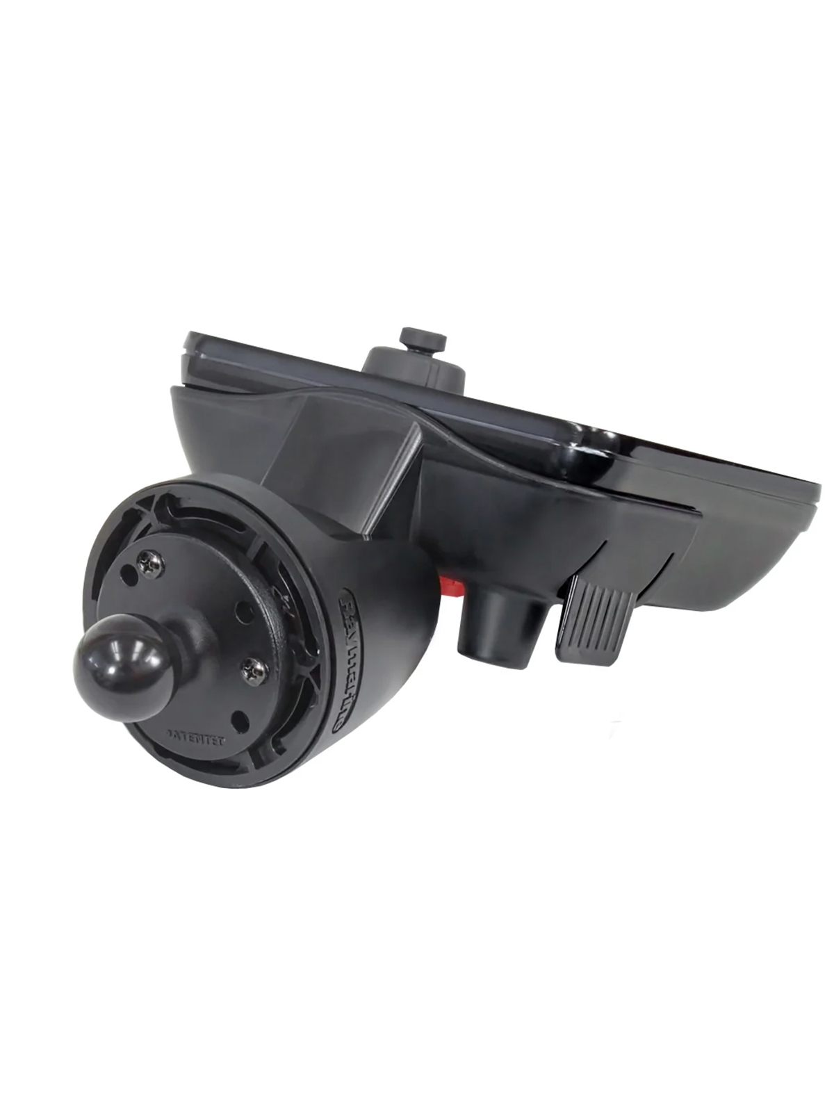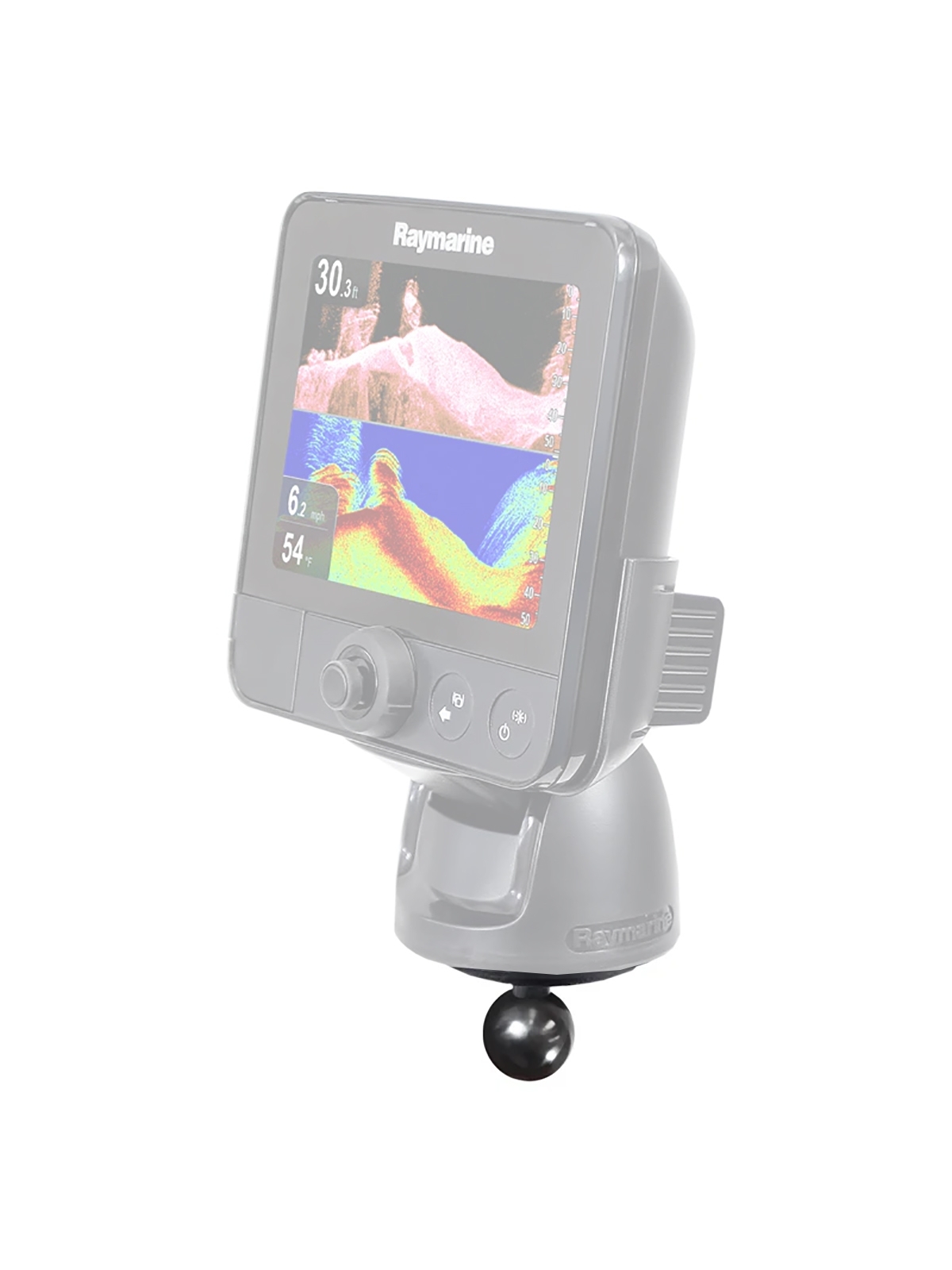 The RAM-B-202U-RYM1 consists of a 1" diameter rubber ball connected to a flat 2.5" diameter base. The base has pre-drilled holes, including the universal AMPs hole pattern. Included are (3 quantity) (#8-32 x 3/4" PH PD Mach Screws) and (3 quantity) (#8-32 SS Nylock Nuts) that will connect the RAM-B-202U-RYM1 to the bottom of all Raymarine® Dragonfly™ Sonar/GPS devices.