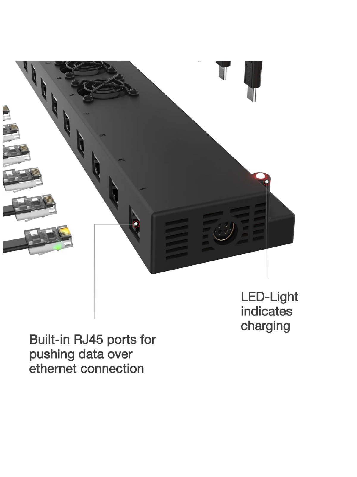 This charger block also features twelve ethernet connection ports (RJ45) that enable fleet-based updates to be securely pushed during downtime. Efficiently charge devices while not in use or overnight with up to 30% faster charging with GDS® Technology™.