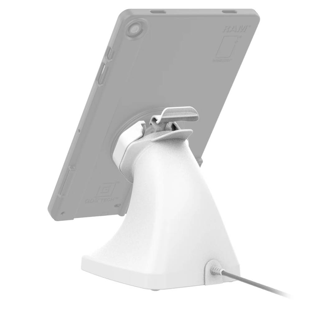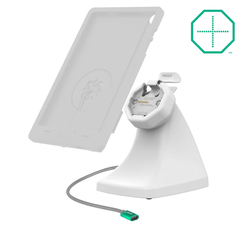 The GDS® Uni-Conn™ Powered Snap-In Kiosk Dock with USB-C - Gray (RAM-GDS-DOCK-D10K-U3-C-GRY) is a free-standing, powered dock for devices enclosed in an IntelliSkin® Thin-Case™ with Rear Pogo Pads. Securely dock and undock your device with the assistance of the mechanical attachment mechanism.