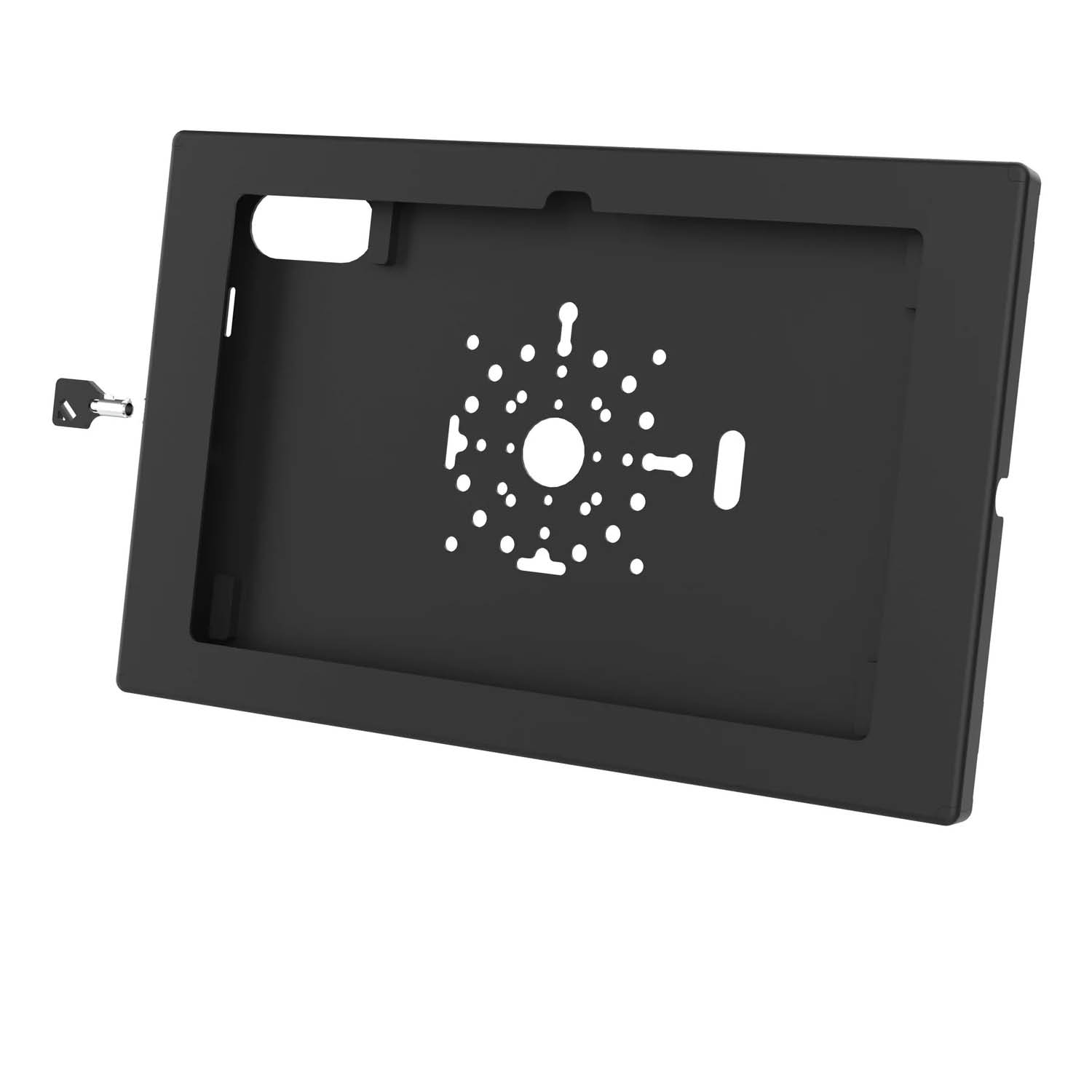 Ventilation slots and speaker openings maintain device functionality without compromising protection. The enclosure features versatile mounting options with integrated hole patterns for flush mounting, compatibility with RAM® double ball mounts, or 75x75mm VESA stands.