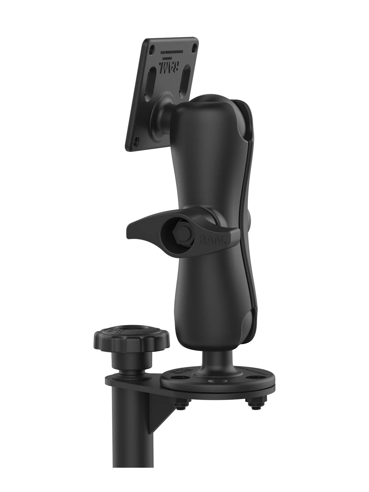 Features Pair this RAM® Tele-Pole™ with a RAM® vehicle base that does not contain a welded female Tele-Pole™ Easily adjust the height of the Tele-Poles™ with the turn of a knob, allowing you to twist and tilt the viewing and operating angle of your connected device Consists of D size mounting components, including a 75x75mm VESA Mount for attaching a double socket arm; ball and socket technology allows for near-infinite adjustability Overview This RAM® Tele-Pole™ consists of an 18" lower pole, a 12" upper pole, double swing arm, and 75x75mm VESA Plate. The lower Tele-Pole™ will attach to all RAM® vehicle bases that do not contain a welded female Tele-Pole™. The height of the Tele-Poles™, combined, can easily be adjusted by turning the knob at the top of the post. Once the knob has been tightened, the Tele-Pole™ becomes a rigid support for connecting devices, allowing you to twist and tilt the viewing and operating angle of your connected device. Socket to socket length: 6.88" Hole pattern: Tele-Pole: 2.625" x 2.625" VESA Plate: 75 x 75mm VESA Ball size: D Size (2.25") Weight capacity: standard use 6 lbs, heavy-duty use 5 lbs