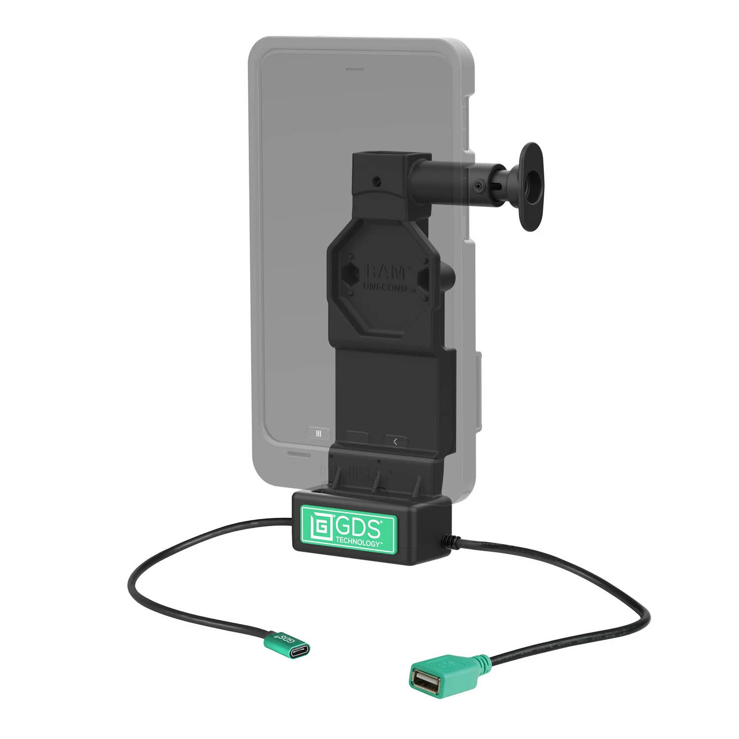 For proper use, the corresponding GDS Uni Conn adapter (RAM-GDS-U1U or RAM-GDS-U1AU) must be installed on the intended IntelliSkin charging protective case.