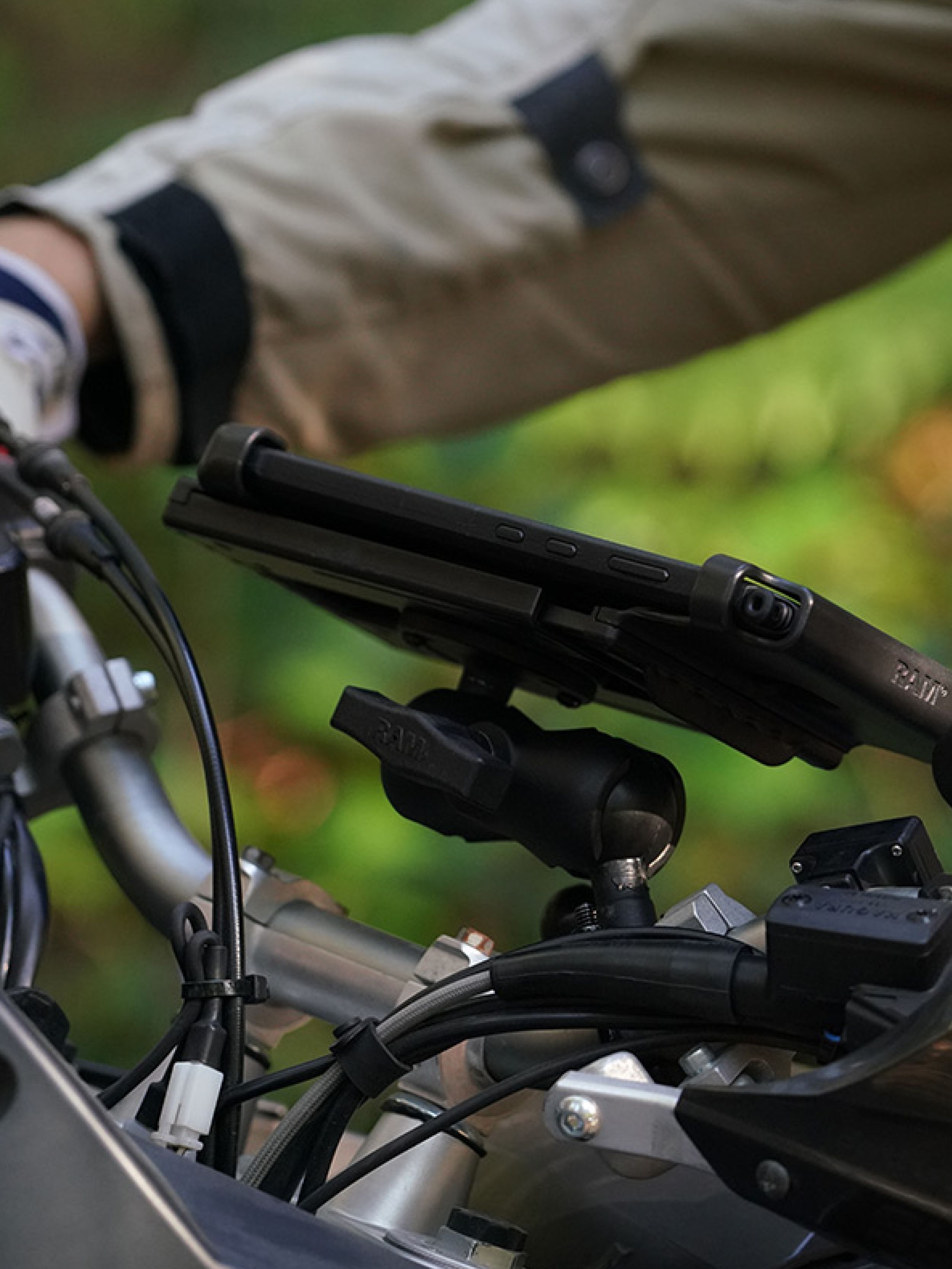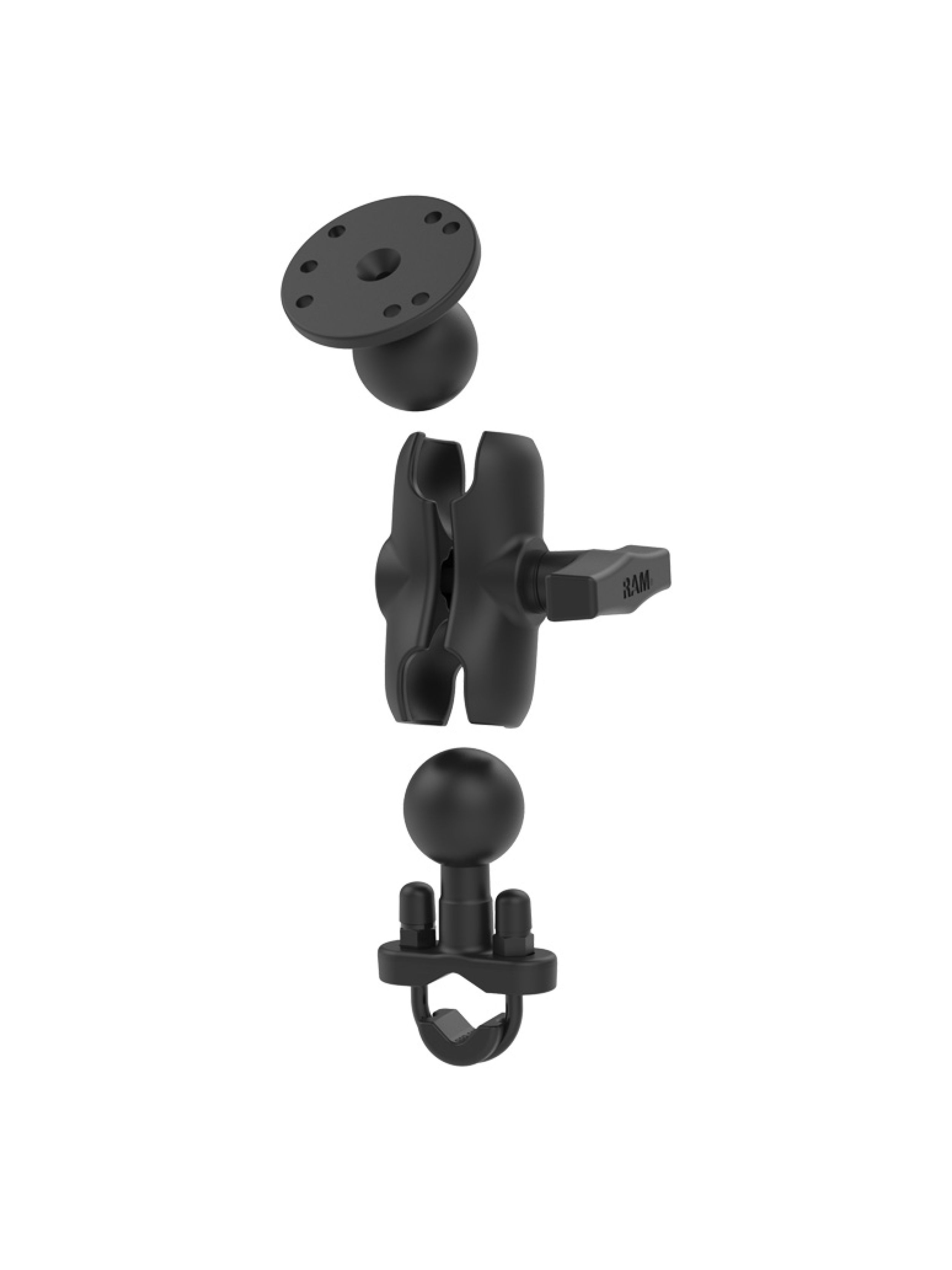 The RAM Handlebar U-Bolt Double Ball Mount with Round Plate consists of a C size (1.5") zinc coated u-bolt base, short C size double socket arm and C size RAM round base adapter for attaching a tablet holder. The round base adapter has a hole pattern that matches the industry standard AMPS hole pattern and will connect to a large variety of RAM Mount and/or third party tablet holders. Included in this package is hardware that will accommodate handlebars and rails from 0.50" to 1.25" in diameter. A composite rail adapter can narrow the rail to a minimum width of 0.5". The mount is designed with a RAM C size 1.5" diameter patented rubber ball and socket system that has adjustment points at both ends of the double socket arm; this allowing for almost infinite adjustment and perfect viewing angles. This mount is ideal for securley mounting a tablet to a motorcycle or ATV/UTV vehicle.