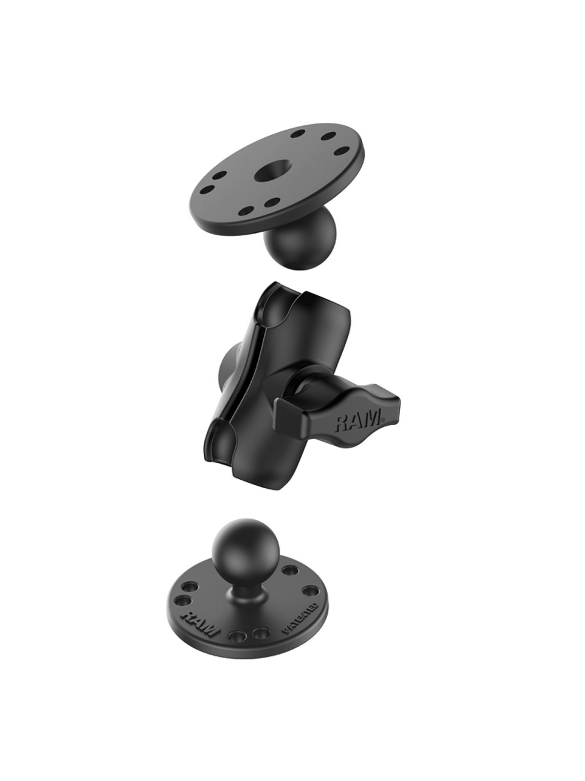 Das RAM Mounts RAM-B-101U-A Aufbau-Set besteht aus einem kurzen Verbindungsarm (1 Zoll - B-Kugel) und zwei runden Basisplatten (1 Zoll - B-Kugel) mit AMPS-Lochmuster.