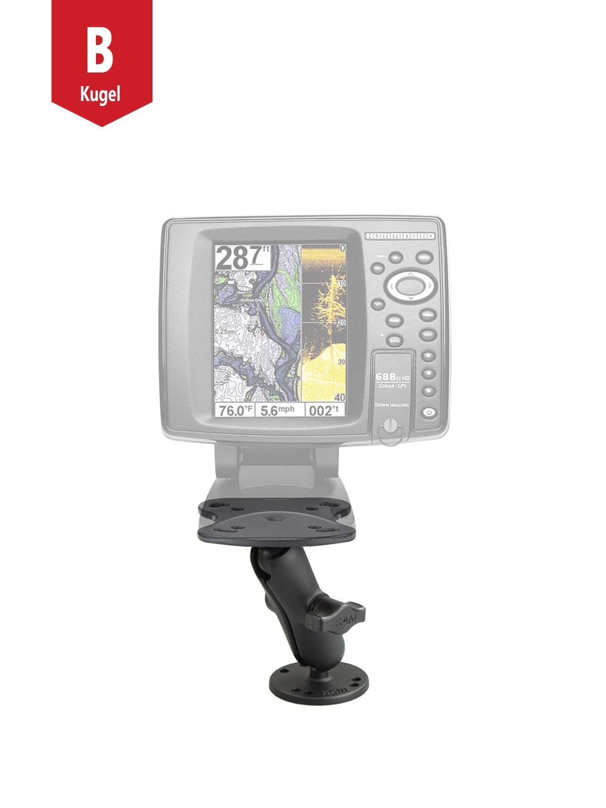 Im Einzelnen besteht das Set aus einer runden Basisplatte, einem mittleren Verbindungsarm sowie einer Adapterplatte für Humminbird Geräte. Die runde Basisplatte besitzt zwei Lochraster - AMPS 4-Loch sowie 120° 3-Loch.