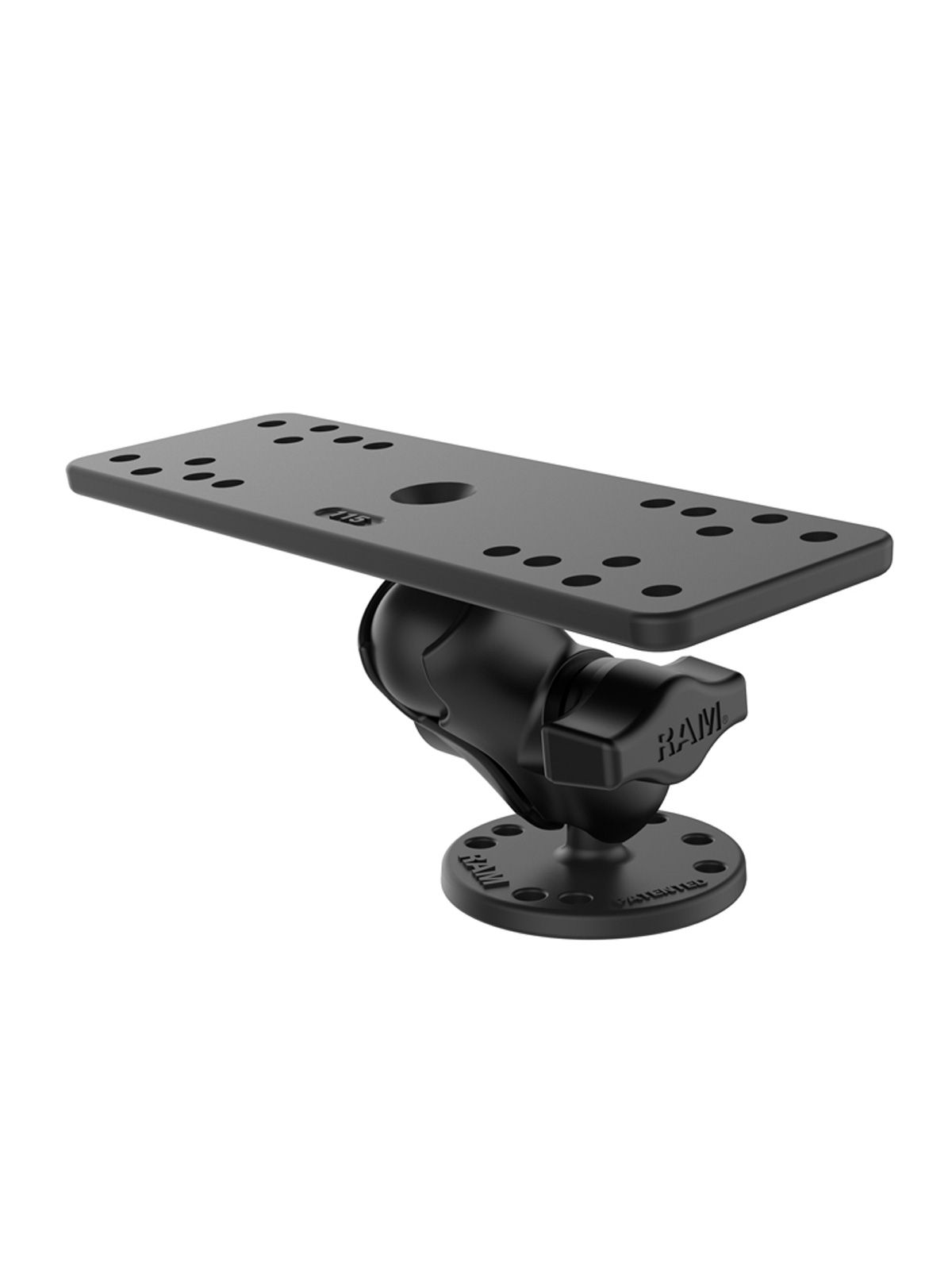 Das RAM Mounts RAM-B-111U-A Aufbau-Set besteht aus einer runden Basisplatte (1 Zoll - B-Kugel), einem kleinen Verbindungsarm (1 Zoll - B-Kugel) und einer Universal-Platte für diverse Marine-Geräte.