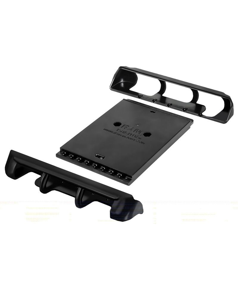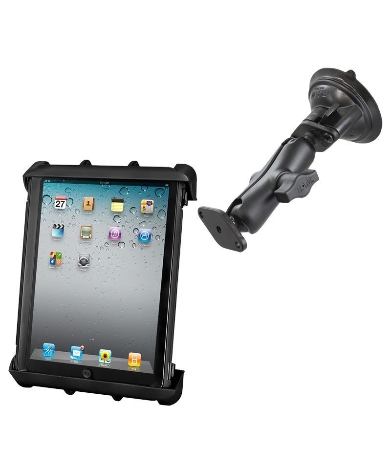 Die RAM MOUNT Saugfusshalterung für 10 Zoll Tablets mit Schutzgehäusen - RAM-B-166-TAB8U - besteht aus einer Saugfussbasis mit Drehverschluss, einer Trapez-Basisplatte, einem mittleren Verbindungsarm (90 mm), einer runden Basisplatte und der Universal Tab-Tite Halteschale. Die Saugfussbasis hält stabil an allen Glas- und anderen glatten Kunststoffoberflächen. Die Halterung basiert auf dem 1-Zoll Kugelsystem und ermöglicht die Einstellung nahezu jeglicher Betrachtungswinkel. Die federgestützte Halteklammer sorgt für sicheren Halt und leichte Entnahme des Tablets.
