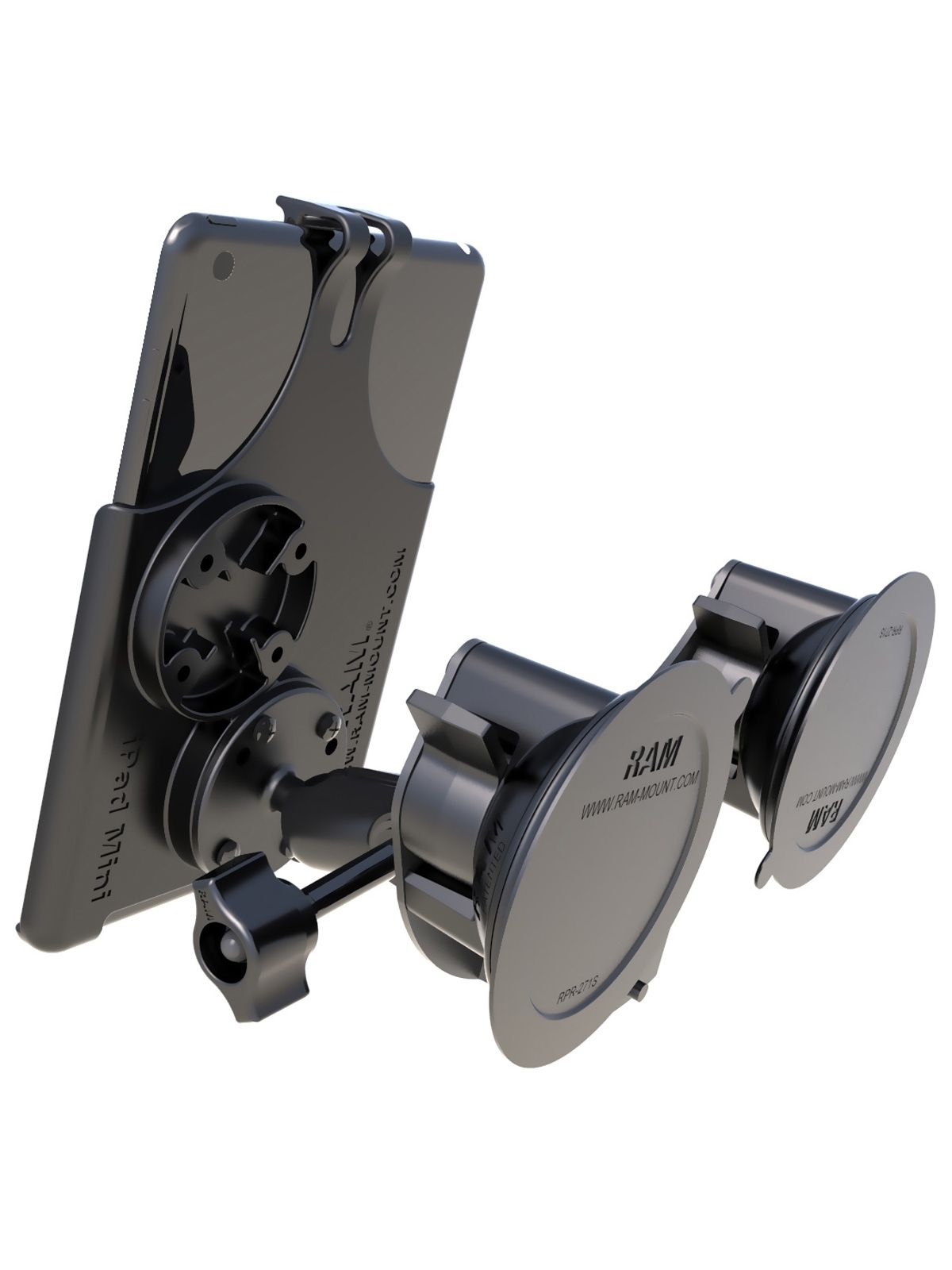 RAM Mounts Doppel-Saugfuss-Halterung für Apple iPad mini 1-3 - B-Kugel (1 Zoll), EZ-Roll'r-Halteschale, mittlerer Verbindungsarm (mit langem Feststellhebel)
