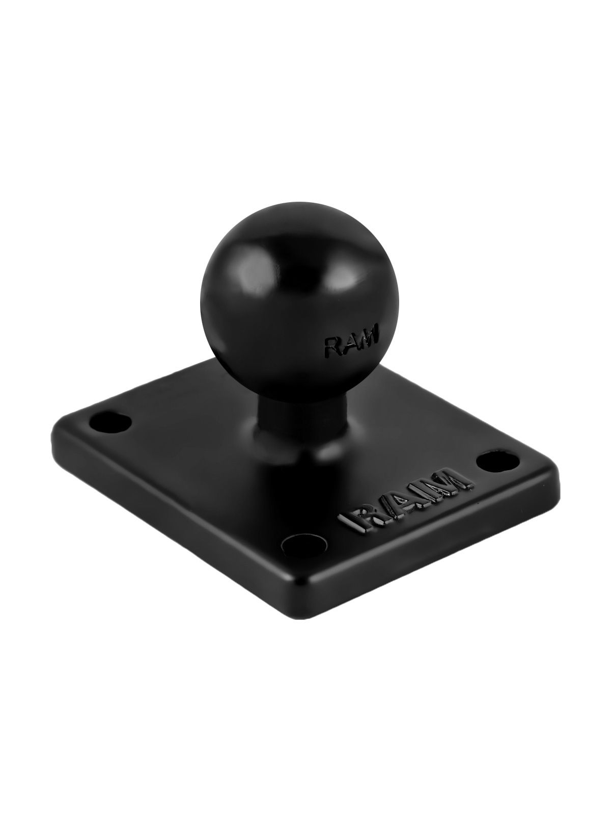 Diese rechteckige RAM Mounts Basisplatte verfügt über eine B-Kugel (1 Zoll), die im rechten Winkel zur Basis steht sowie 4 vorgebohrte Löcher an jeder Ecke (AMPS-Lochraster). Die Mittelpunkte der Löcher sind jeweils 1/4 Zoll (6,35 mm) vom Rand entfernt. Die Entfernung zwischen den Lochmittelpunkten beträgt 38,1 und 30,5 mm. Die Basis an sich hatte eine Fläche von 50,8 x 43,18 mm.