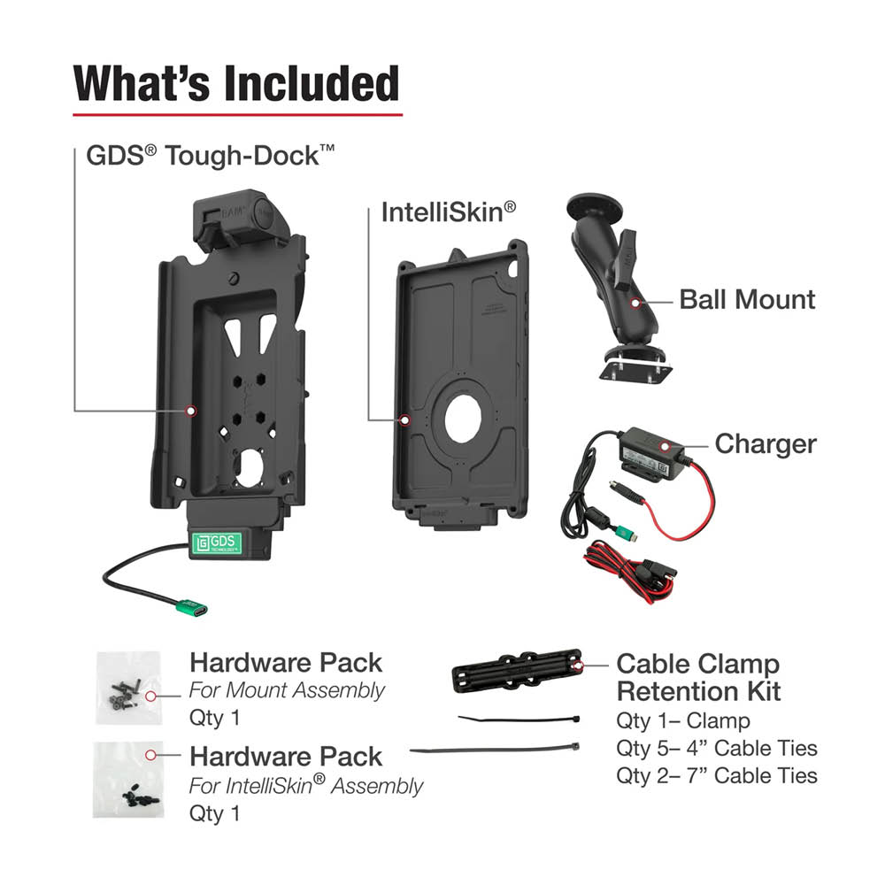 - Bundle includes non-locking GDS® Tough-Dock™, IntelliSkin® Next Gen for Samsung Tab A9+, hardwire charger with USB-C connector, low-profile double ball mount with C size (1.5") ball, backing plate adapter and cable clamp