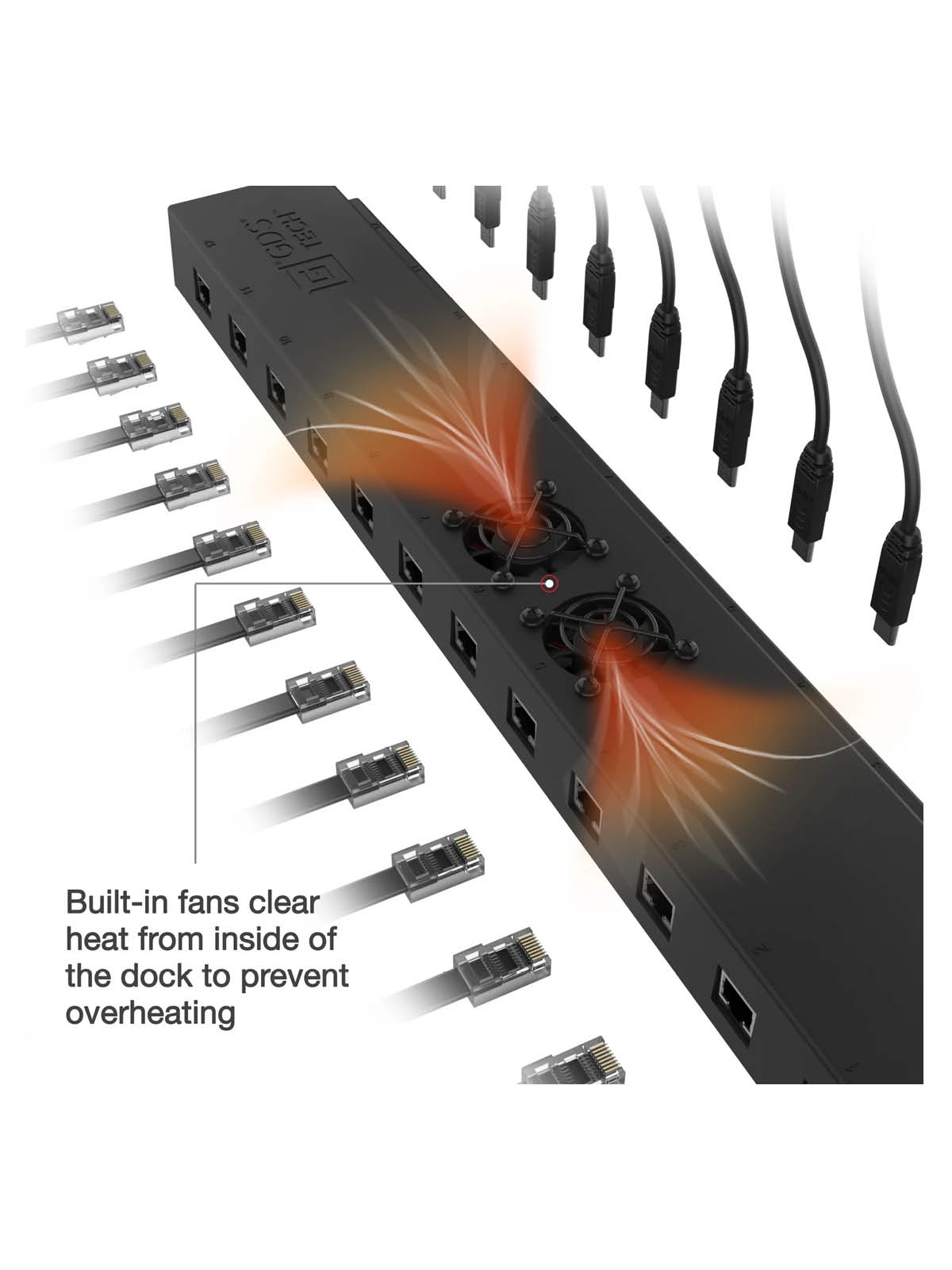 This charger block also features twelve ethernet connection ports (RJ45) that enable fleet-based updates to be securely pushed during downtime. Efficiently charge devices while not in use or overnight with up to 30% faster charging with GDS® Technology™.