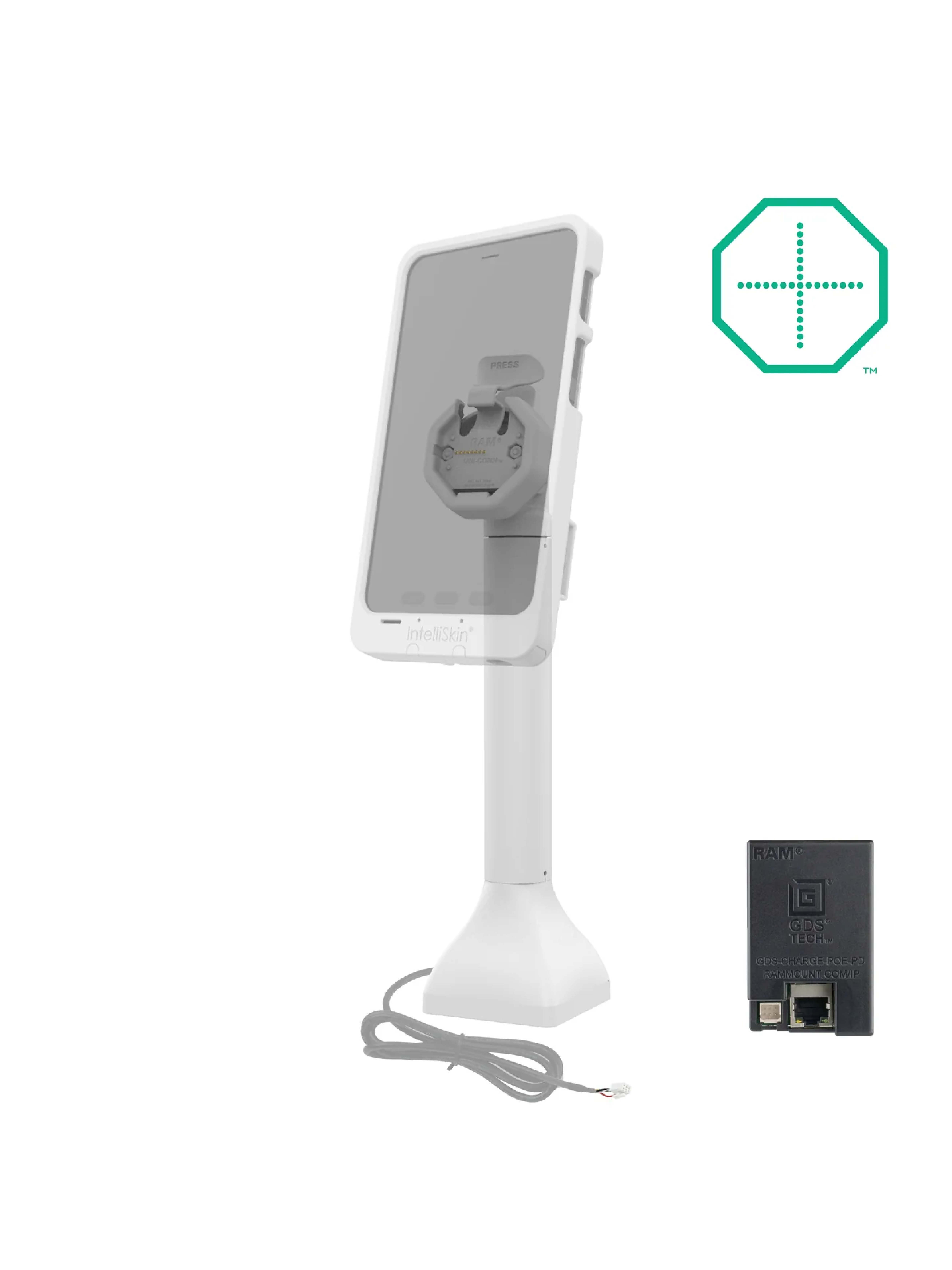 Die Stromversorgung erfolgt über Power over Ethernet (PoE) und einen JST Anschluss zu den in der IntelliSkin Thin-Case rückseitigen Pogo-Pads.