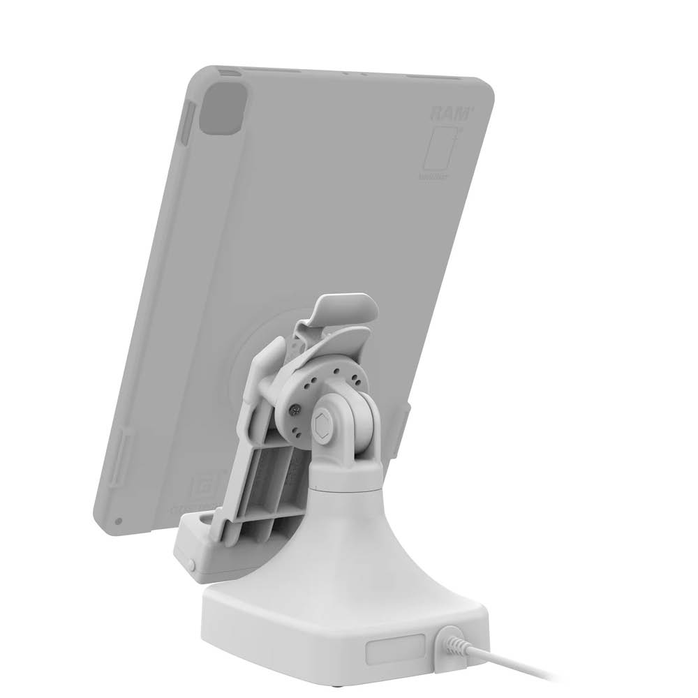 Die Snap-In Halterung hält Ihr Gerät sicher und ermöglicht gleichzeitig schnelles Laden über die integrierten Pogo-Pins, die Stromversorgung erfolgt über Power over Ethernet (PoE) und einen RJ45 Anschluss.