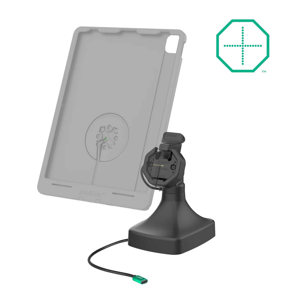 Die RAM Mounts GDS Uni-Conn Stand-Dockingstation ist eine freistehende Dockingstation und für Geräte in einer IntelliSkin Thin-Case mit rückseitigen Pogo-Pads geeignet.