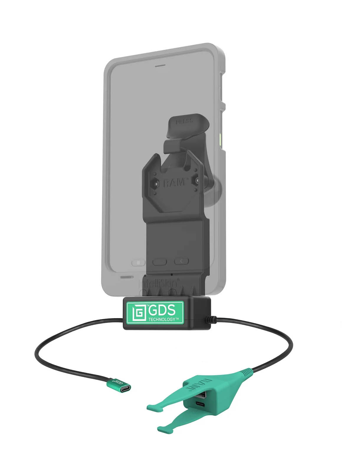 Für die Dockingstation muss der GDS Uni-Conn Adapter (RAM-GDS-U1U) auf der vorgesehenen IntelliSkin-Schutzhülle montiert sein.
