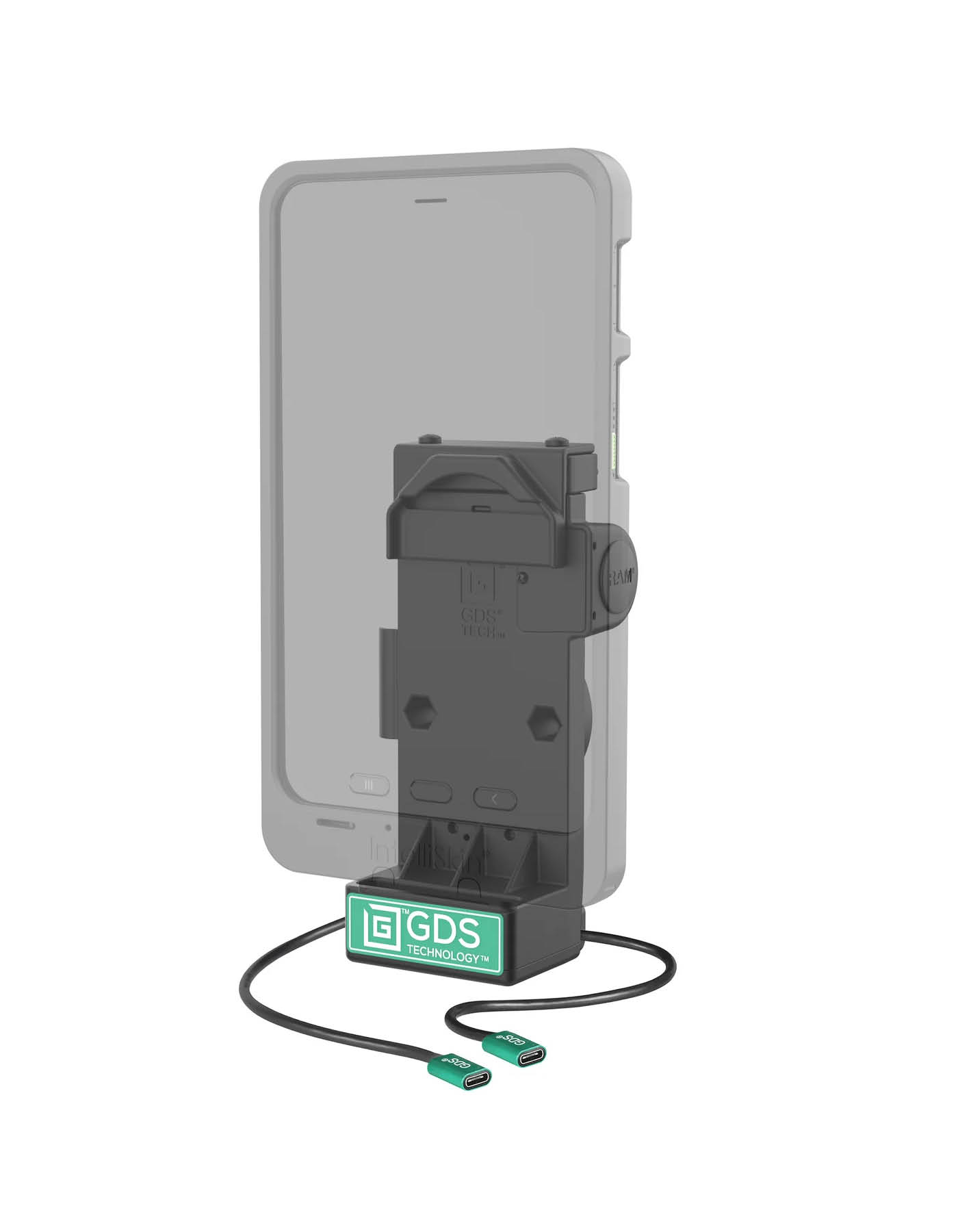 Für die Dockingstation muss der GDS Uni-Conn Adapter (RAM-GDS-U1U) auf der vorgesehenen IntelliSkin-Schutzhülle montiert sein.