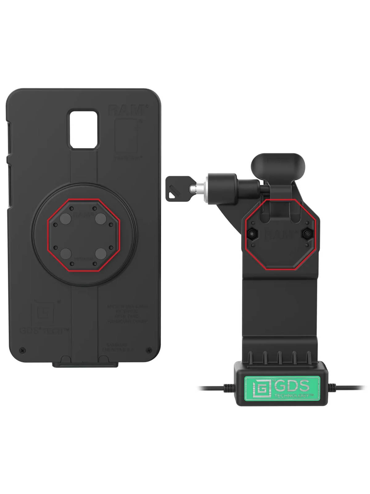 Die RAM Mounts GDS Uni-Conn Halterung mit Schlüsselverriegelung (Links) ist eine universelle Dockingstation, die speziell für Geräte in einer IntelliSkin-Schutzhülle mit Uni-Conn Adapter entwickelt wurde.