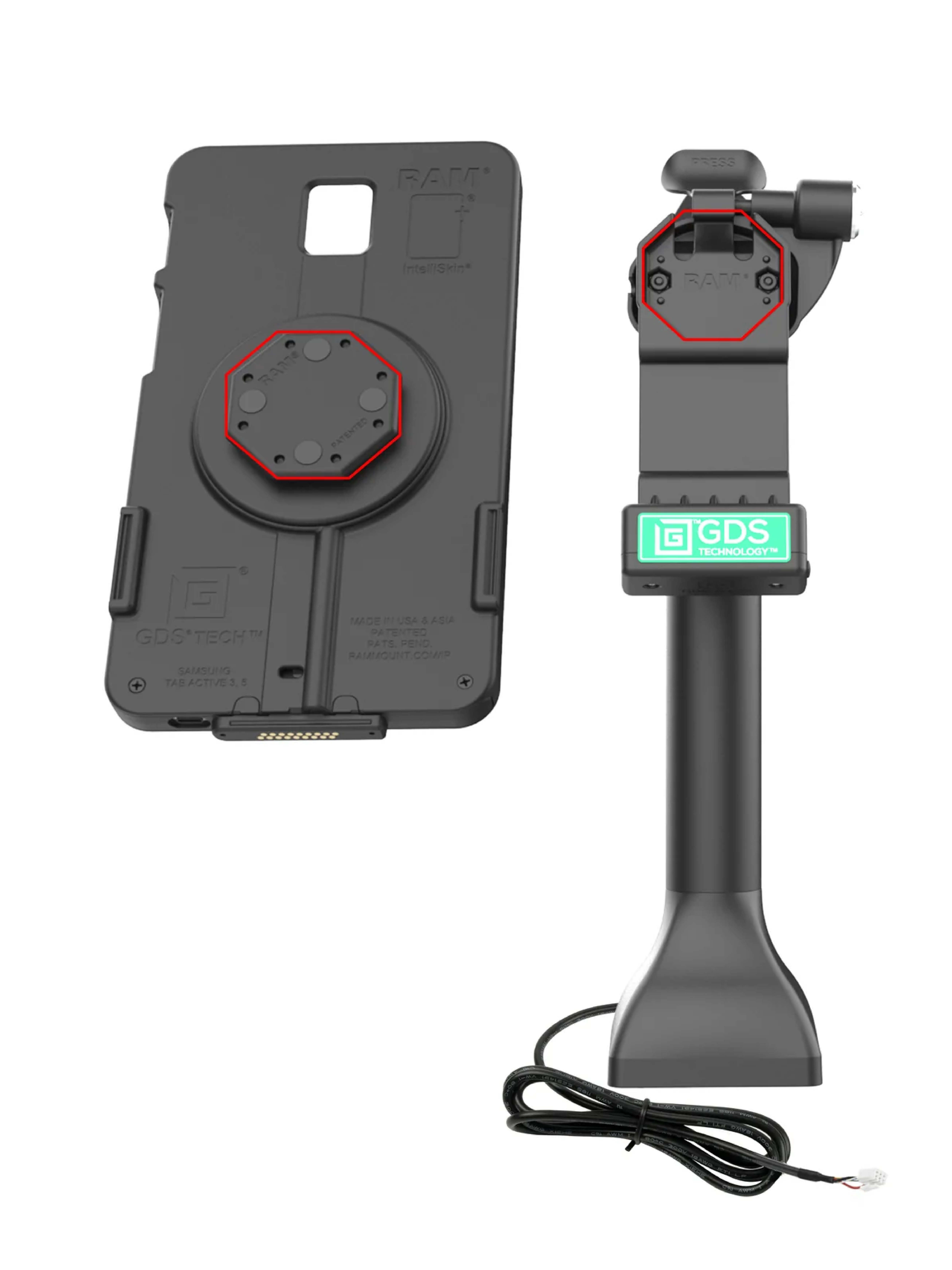 Die RAM Mounts GDS Uni-Conn Stand-Dockingstation (14 Zoll) mit Schlüsselverriegelung (Rechts) ist eine freistehende Dockingstation und für Geräte in einer IntelliSkin Next-Gen, IntelliSkin Hard Case oder IntelliSkin Thin-Case mit montierten GDS Uni-Conn Adapter geeignet.