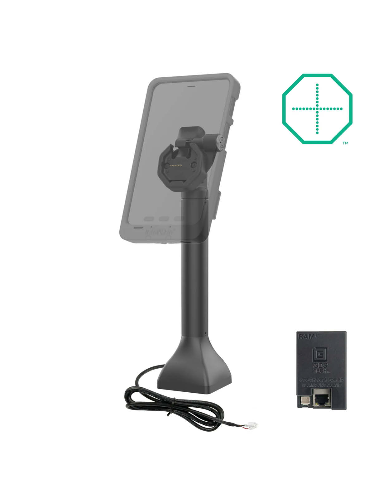 Die RAM Mounts GDS Uni-Conn Stand-Dockingstation (14 Zoll) mit Schlüsselverriegelung (Rechts) ist eine freistehende Dockingstation und für Geräte in einer IntelliSkin Thin-Case mit rückseitigen Pogo-Pads geeignet.