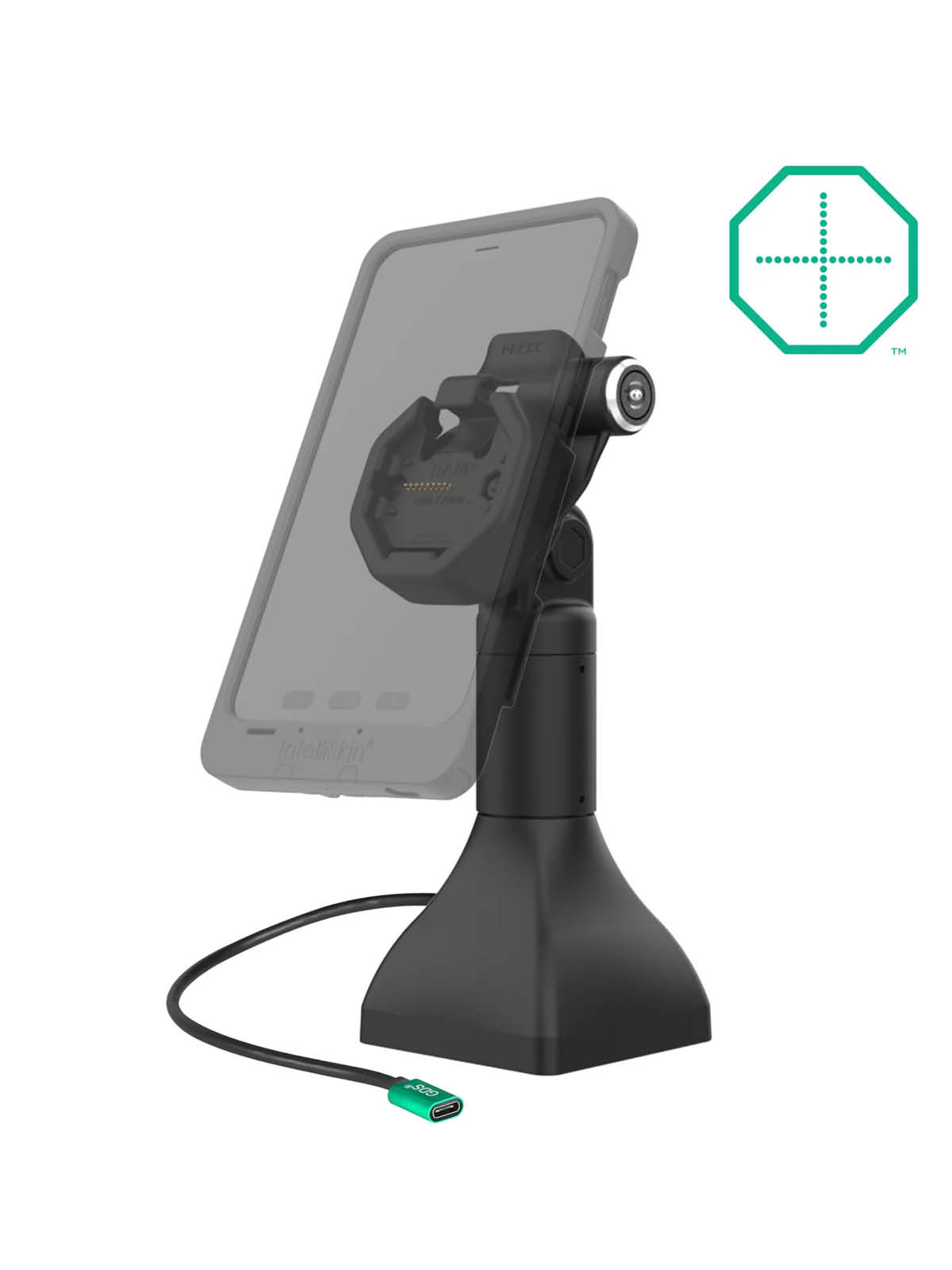 Die RAM Mounts GDS Uni-Conn Stand-Dockingstation (7 Zoll) mit Schlüsselverriegelung (Rechts) ist eine freistehende Dockingstation und für Geräte in einer IntelliSkin Thin-Case mit rückseitigen Pogo-Pads geeignet.