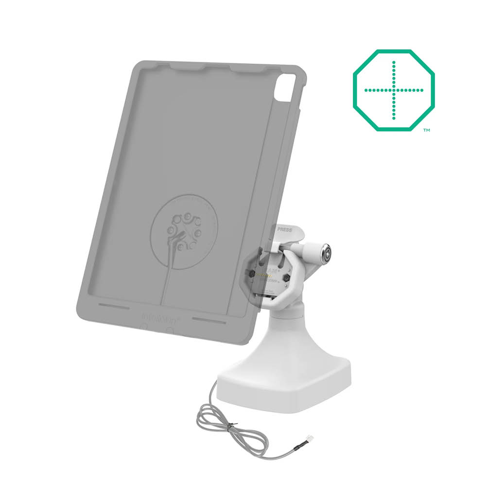 Die Snap-In Halterung hält Ihr Gerät sicher und ermöglicht gleichzeitig schnelles Laden über die integrierten Pogo-Pins, die Stromversorgung erfolgt über Power over Ethernet (PoE) und einen RJ45 Anschluss.