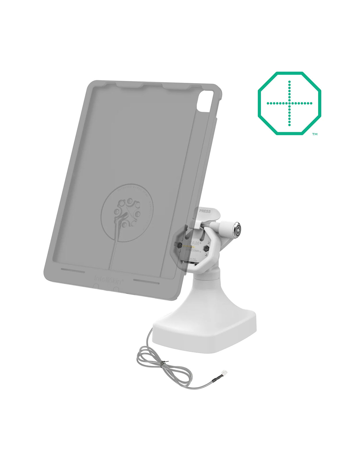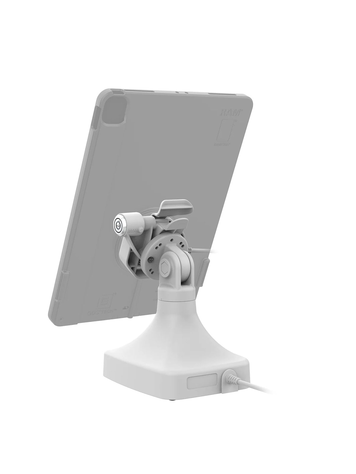 Die RAM Mounts GDS Uni-Conn Stand-Dockingstation mit Schlüsselverriegelung (Rechts) ist eine freistehende Dockingstation und für Geräte in einer IntelliSkin Thin-Case mit rückseitigen Pogo-Pads geeignet.