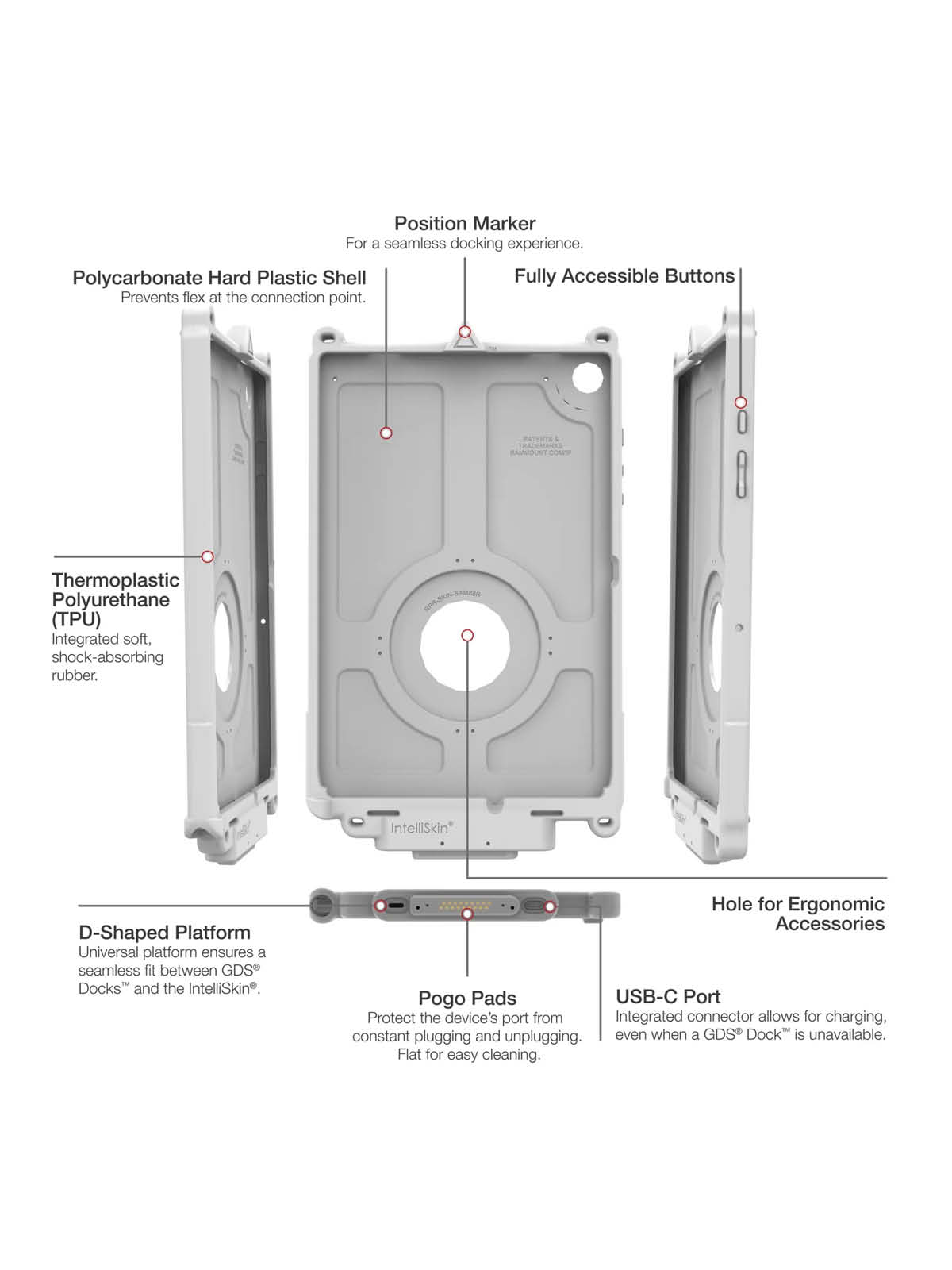 Die IntelliSkin Schutzhülle ist kompatibel mit zahlreichen GDS-Halterungen und weiteren GDS-Dockingstationen, was sie ideal für den professionellen Einsatz macht – sei es im Fahrzeug, am Arbeitsplatz oder im mobilen Einsatz.