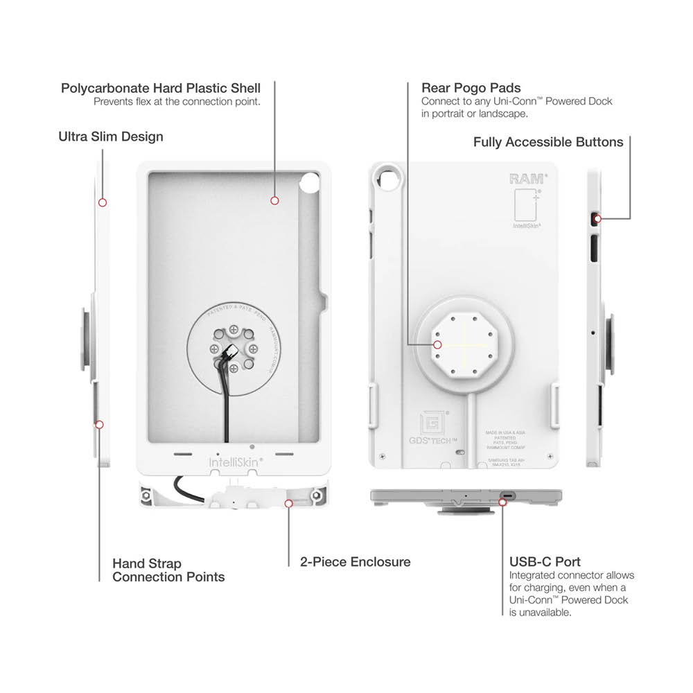Diese RAM Mounts IntelliSkin Thin-Case Ladeschutzhülle mit rückseitigen Pogo-Pads ist für das Samsung Galaxy Tab A9+ geeignet und ist ein schlankes, zweiteiliges Gehäuse, das speziell für die Verwendung mit der GDS Uni-Conn Dockingplattform entwickelt wurde.