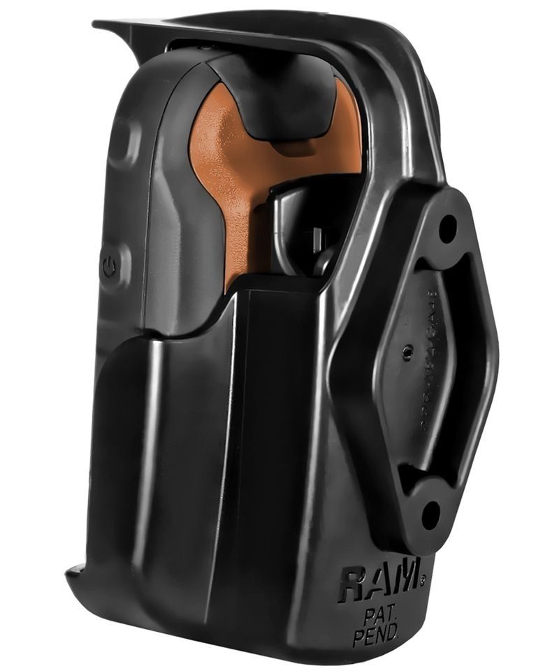 RAM Mounts Gerätehalteschale - RAM-HOL-GA48U - passend für die Garmin eTrex 10/20/30 GPS Geräteserien (ohne Schutzhüllen). Das patentierte Rollbügelsystem (oben) sorgt für sicheren Halt und einfache Entnahme des Gerätes. Die Rückseite ist für die Aufnahme einer Diamond-Basisplatte (Trapez) vorbereitet.