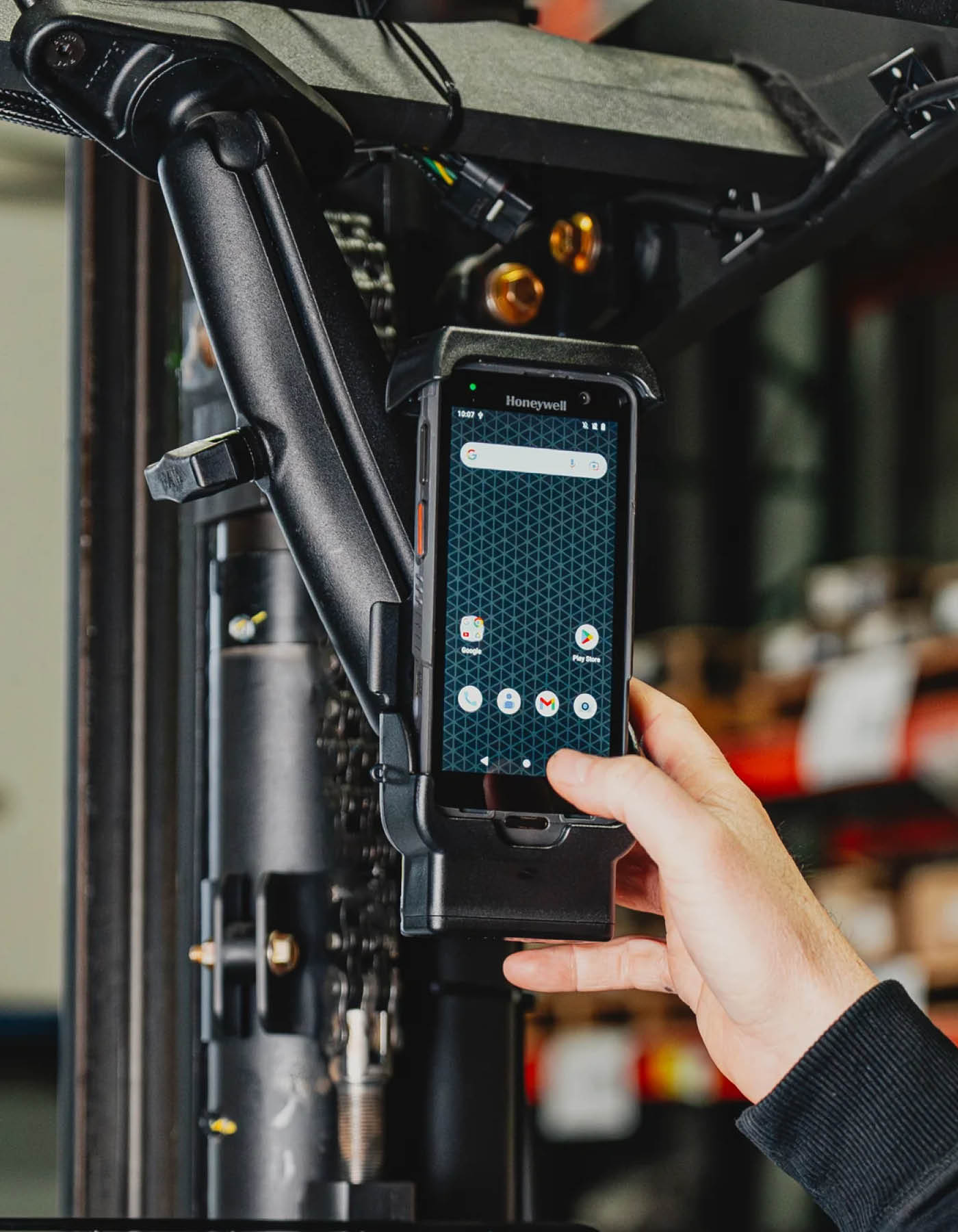 Die Halteschale ermöglicht durch die Aussparung der Rückseite, dass die Scanfunktion des Handheld weitergenutzt werden kann.